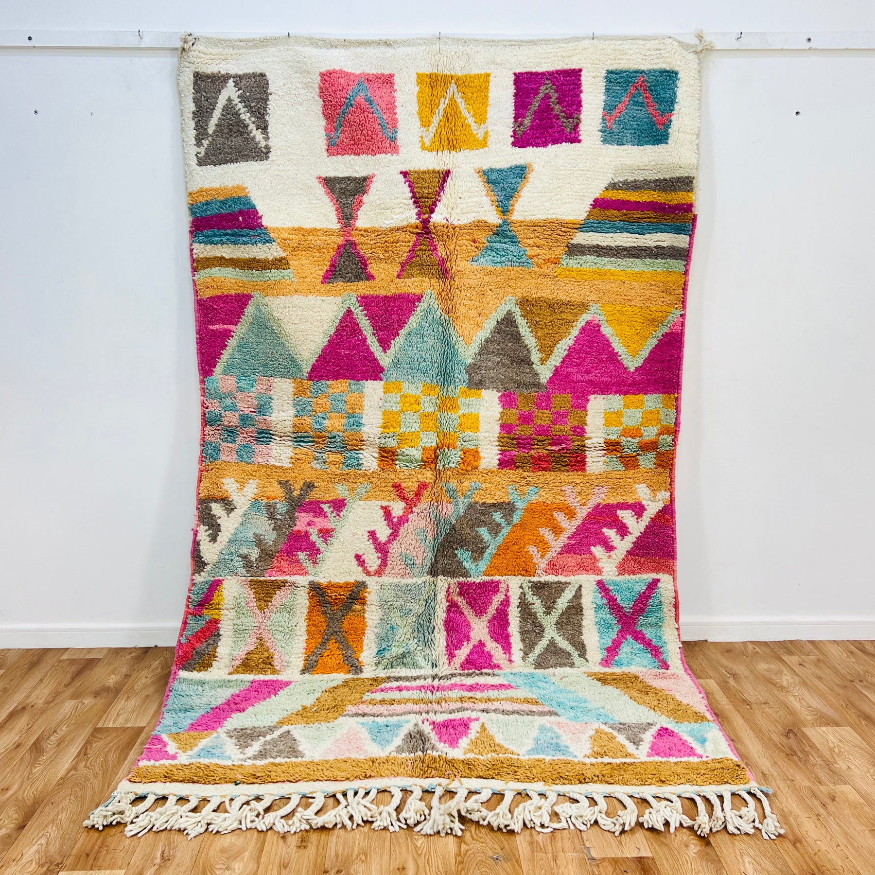 Bring joyful energy to your space with this vibrant handmade Moroccan rug. Featuring bold geometric patterns, diamond shapes, and checkerboard motifs, the design bursts with pink, turquoise, orange, and yellow hues against a soft ivory background.