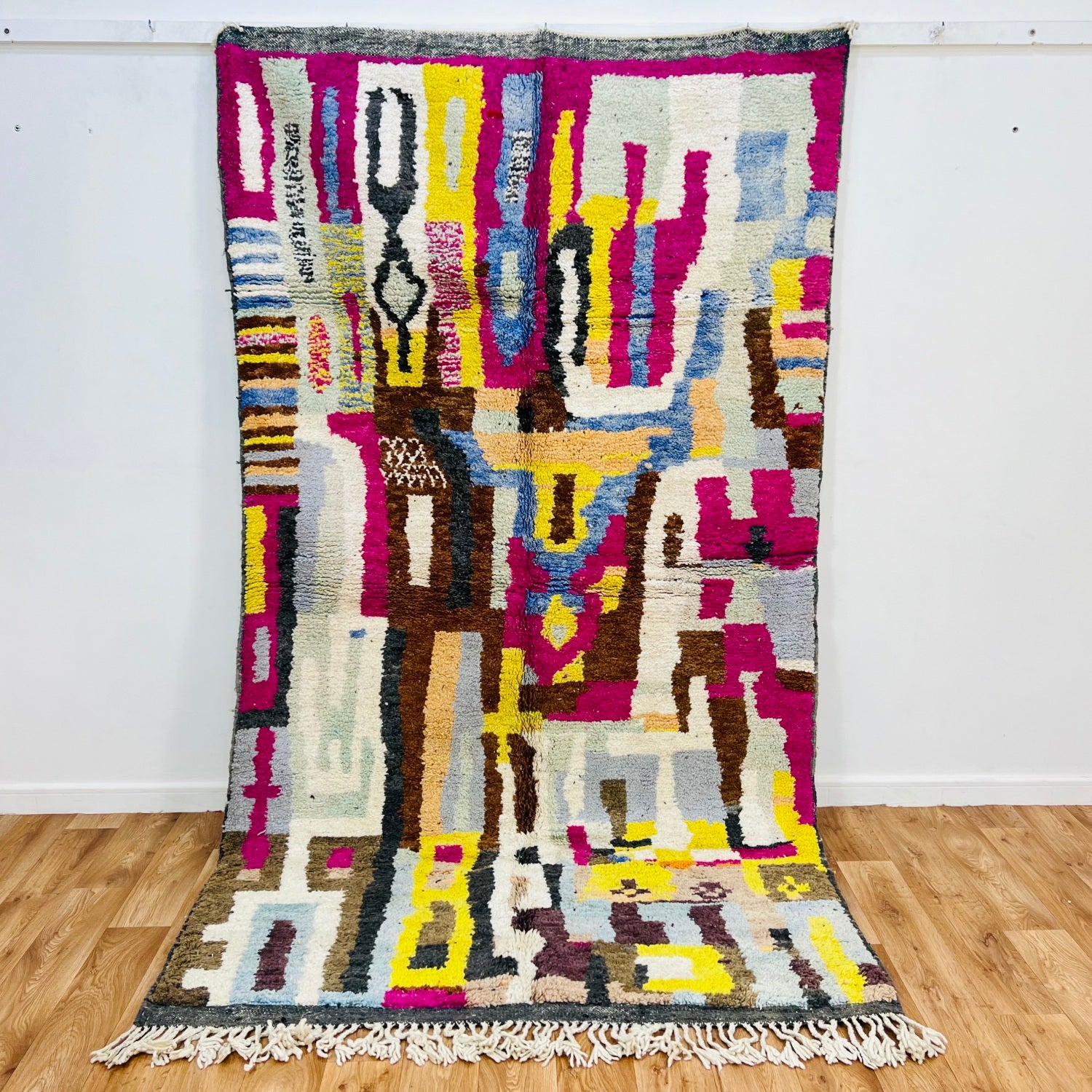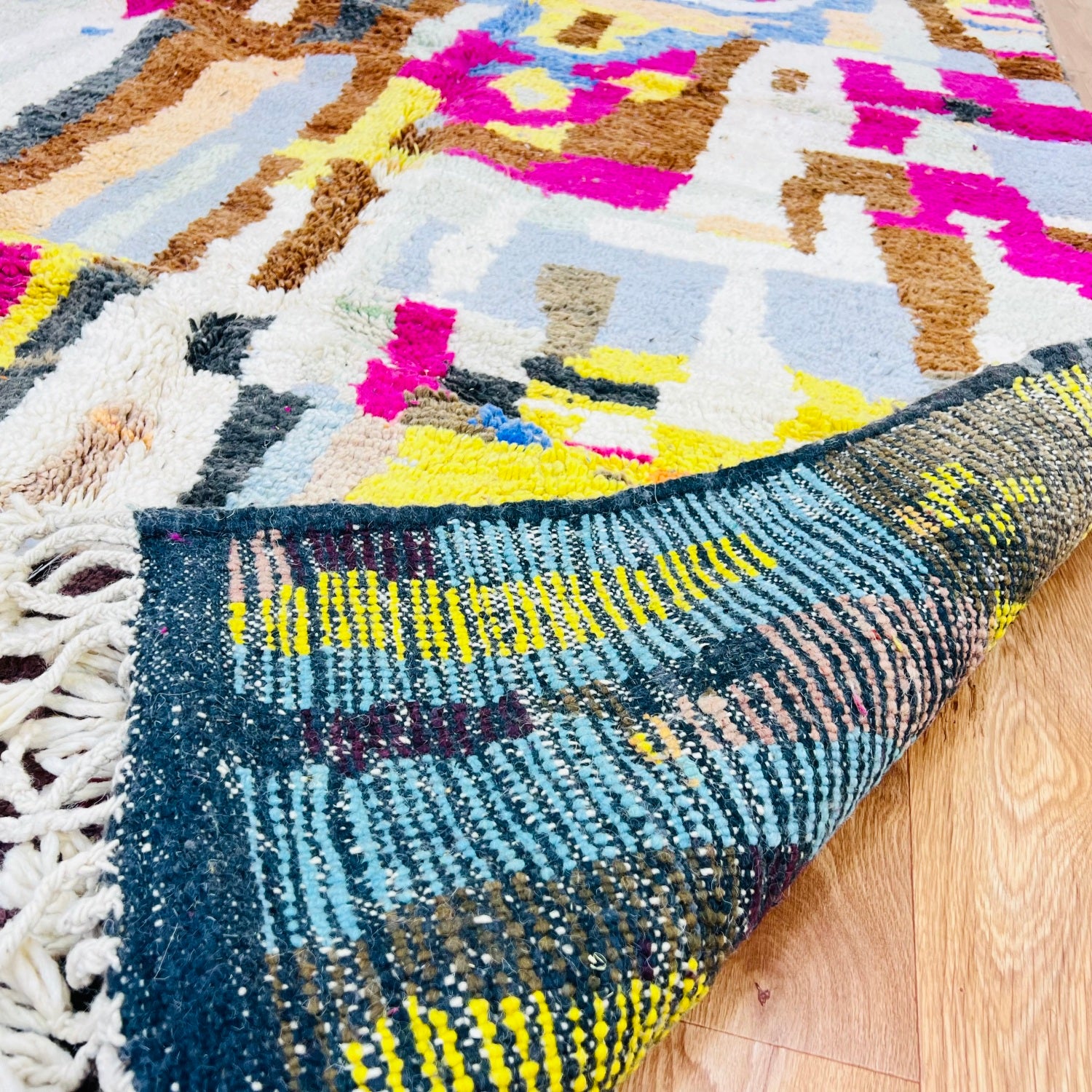 Bring bold, artistic energy into your home with this handmade Moroccan wool rug (Rug 376), crafted in the heart of the Atlas Mountains by skilled Berber women artisans. This vintage Moroccan rug features an expressive abstract geometric pattern, woven in a lively blend of colors—magenta, mustard yellow, sky blue, ivory, chocolate brown, and soft grey tones.