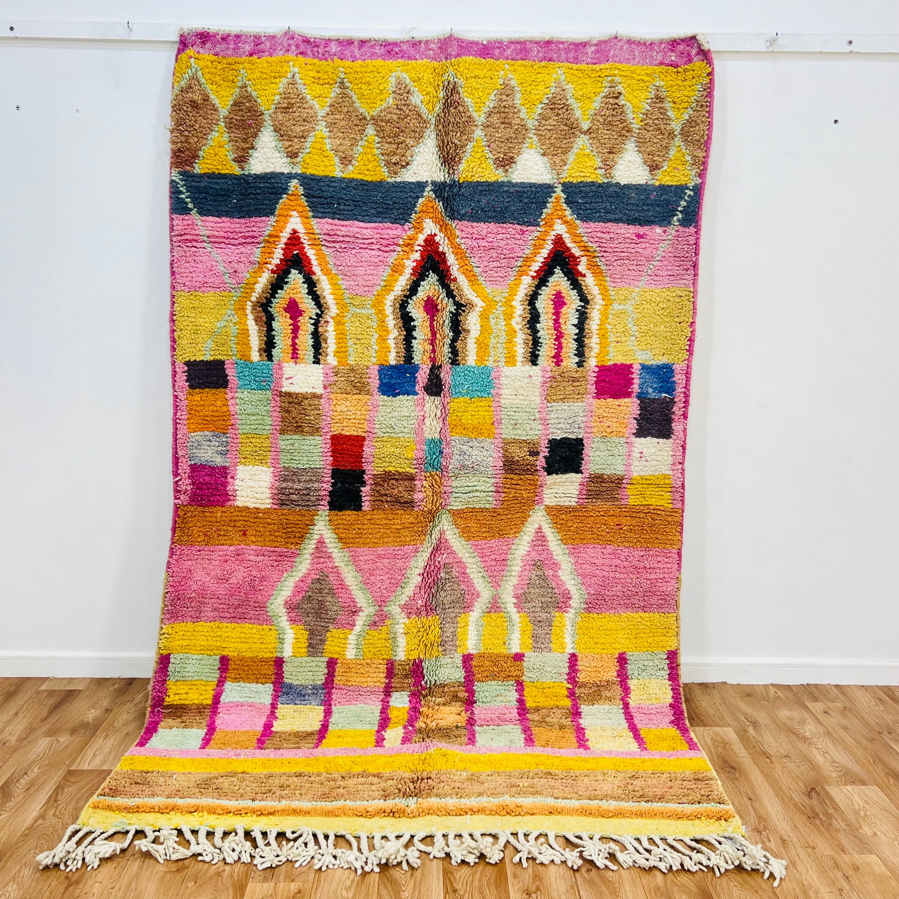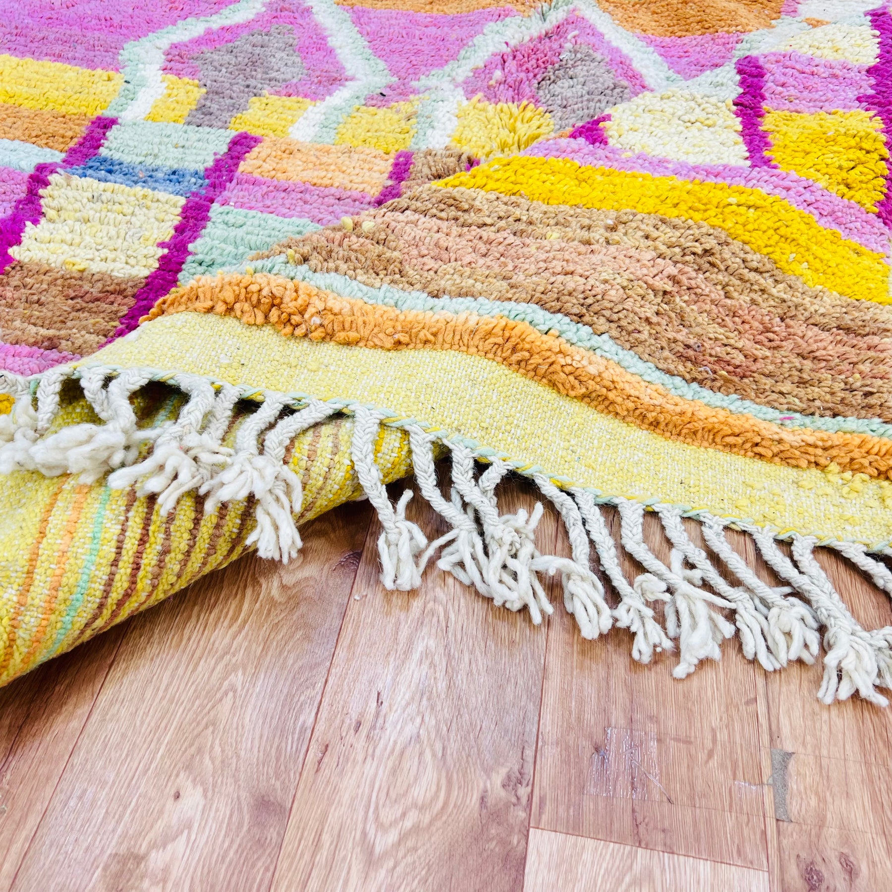Colorful Moroccan wool rug with yellow, pink, and orange geometric patterns, showcasing traditional Berber design.
