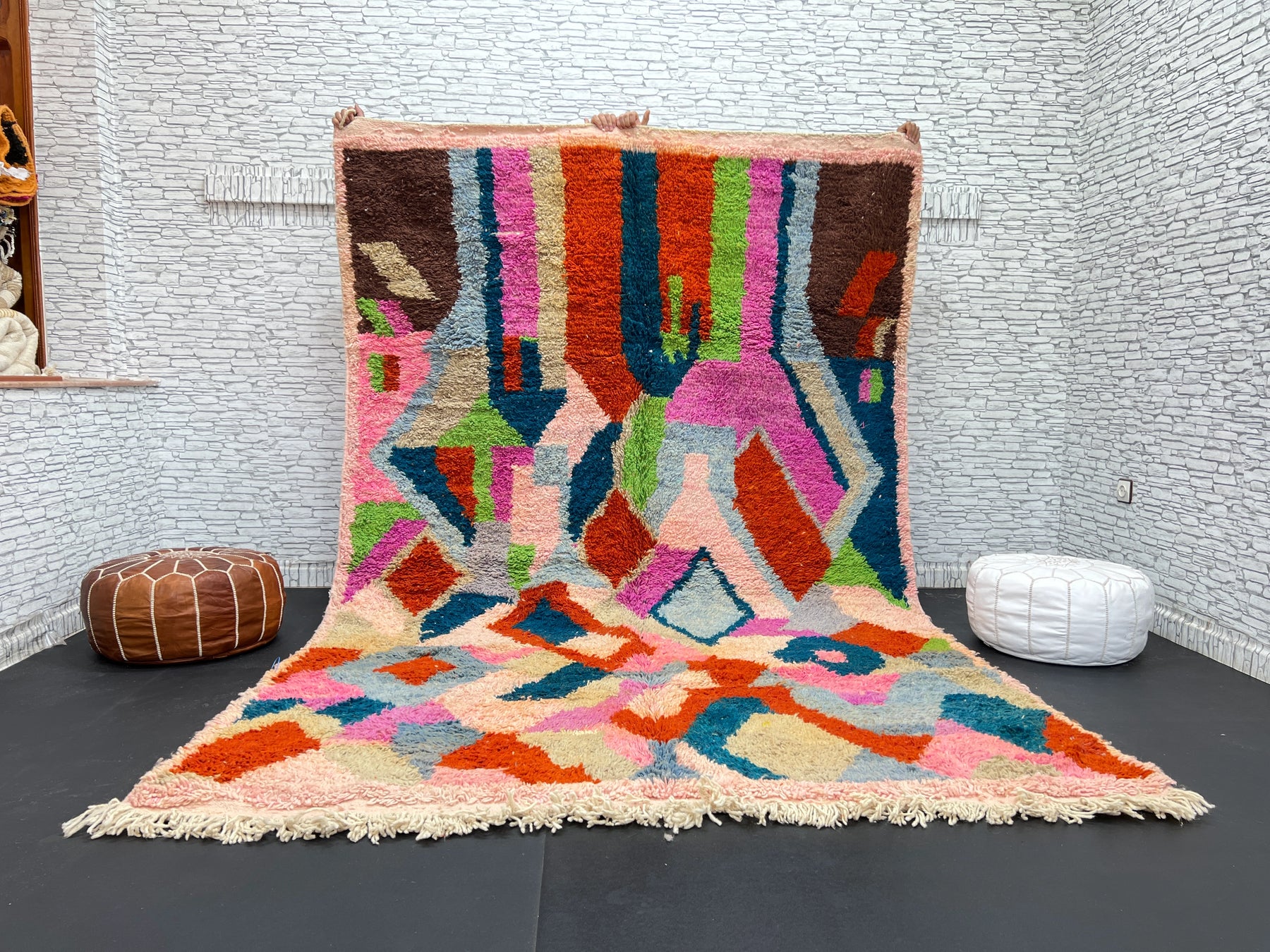 This Colorful Moroccan Wool Rug is a masterpiece of Berber artistry, handwoven from 100% natural wool by skilled Moroccan artisans. Its vibrant abstract geometric pattern features rich hues of pink, blue, orange, green, and red, creating a lively mosaic that brings warmth and energy to any interior.