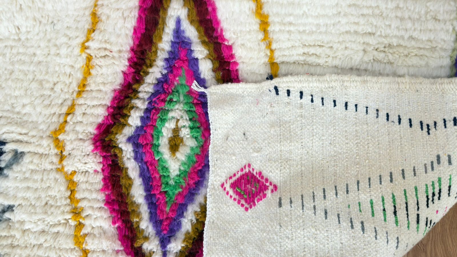 Bring joy and color into your home with this Colorful Azilal Moroccan Rug, handwoven from 100% natural wool by Berber artisans in the Atlas Mountains. Its cream base highlights bold diamond motifs in pink, blue, yellow, and green, accented with playful arrow and plant-like patterns.