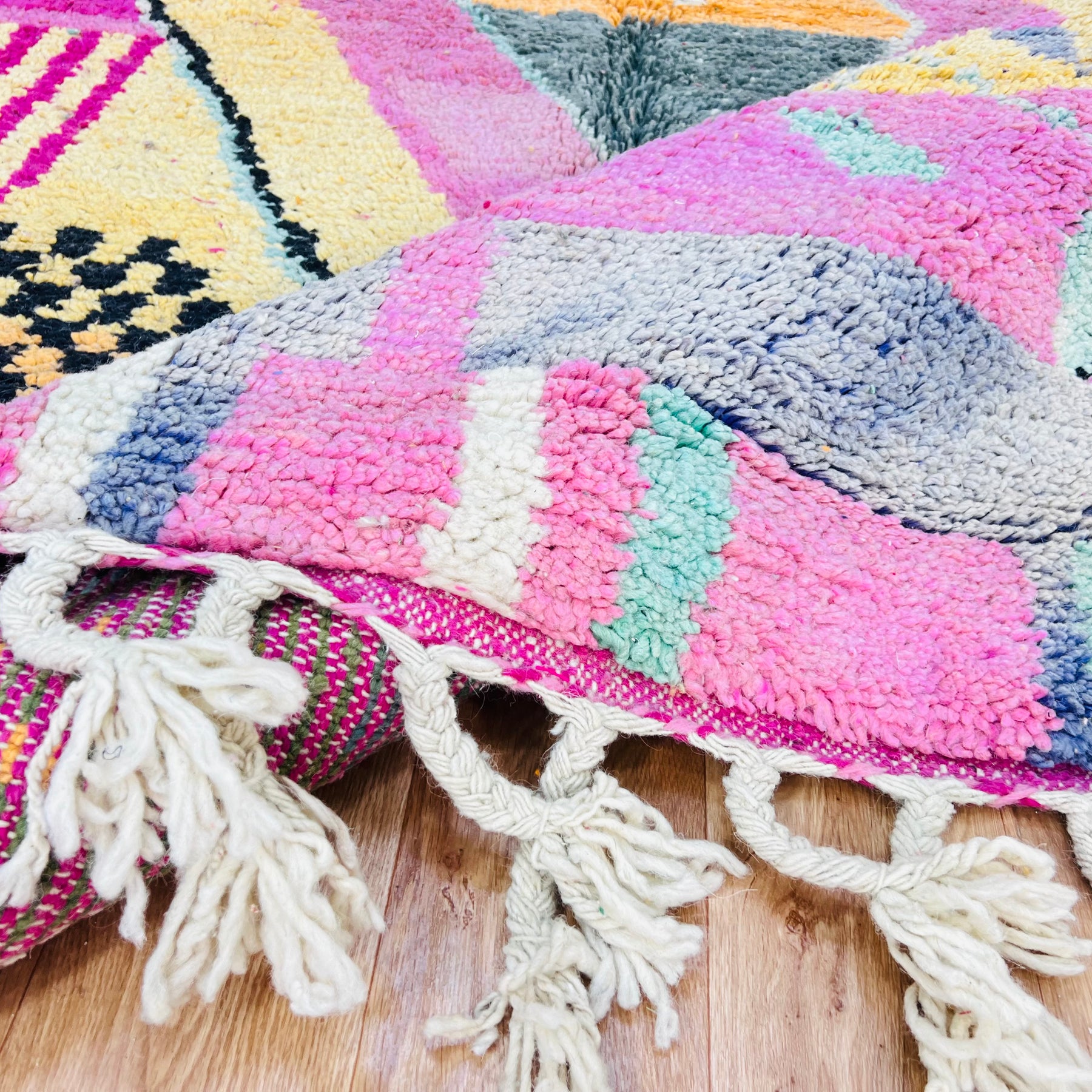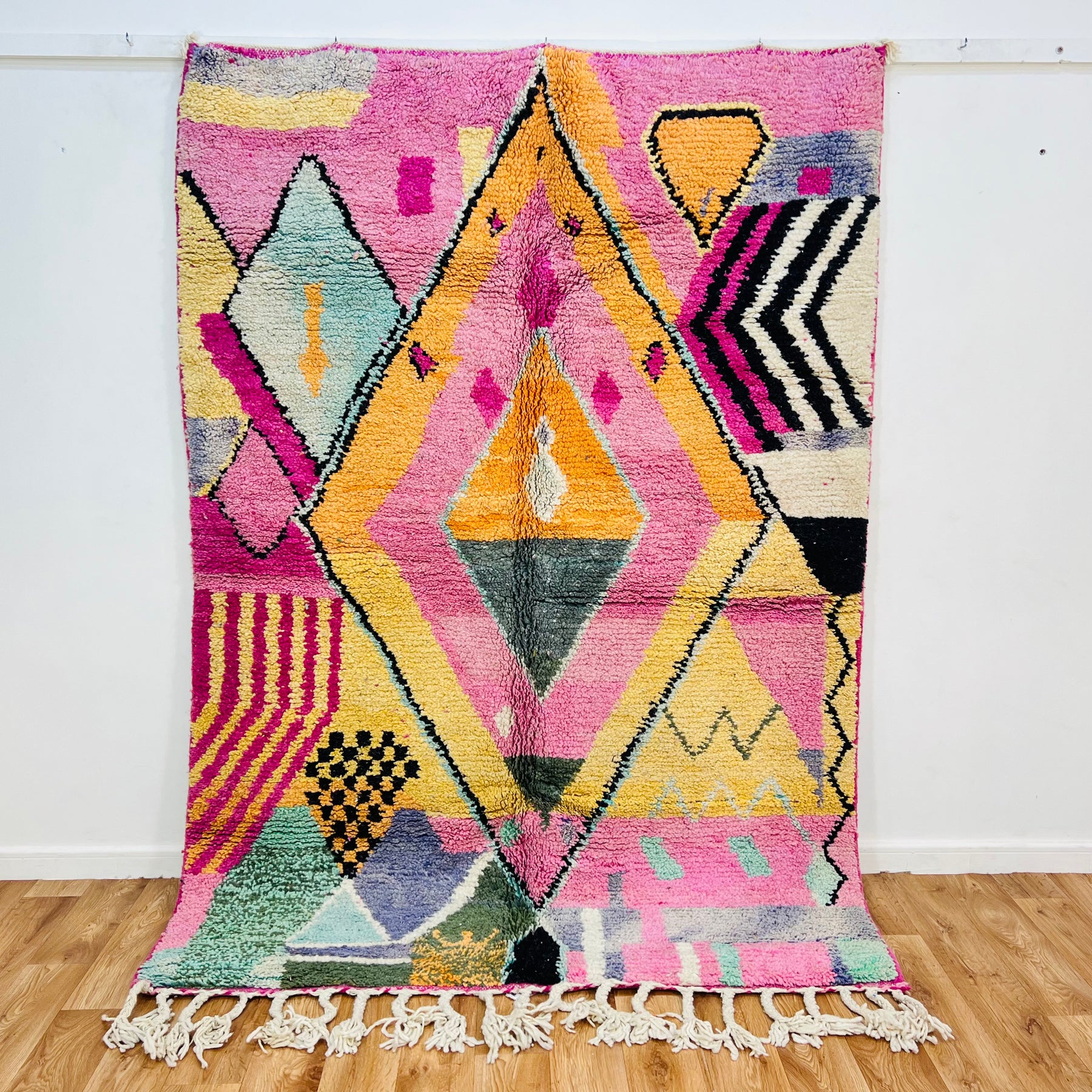 Add a bold statement to your space with this Pink Diamond Moroccan Wool Rug, handmade by Berber women using time-honored weaving techniques and pure natural wool. This stunning rug features a commanding central diamond in vibrant shades of pink, mustard, orange, green, and black — surrounded by zigzags, stripes, and checkered symbols that speak of tradition and creativity.
