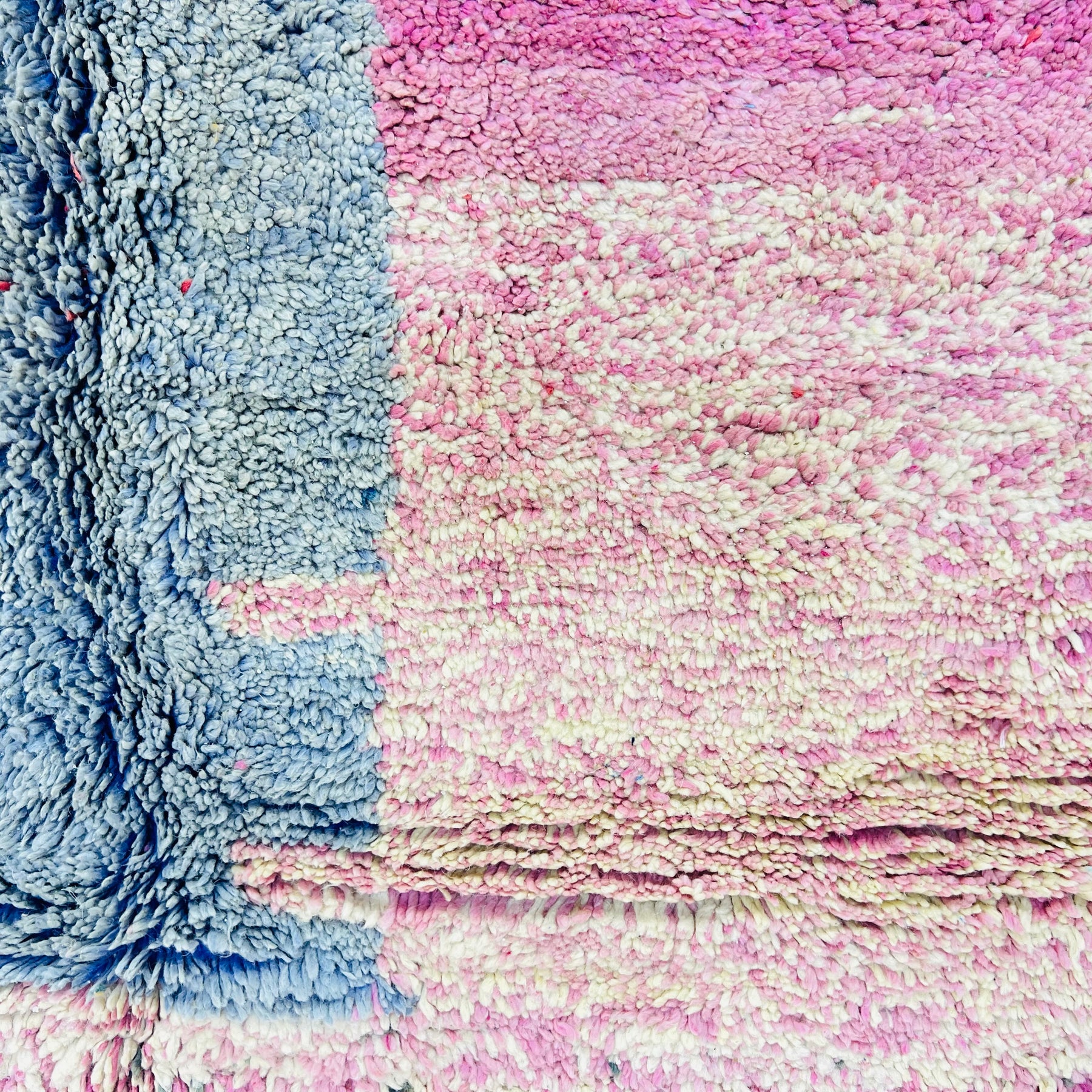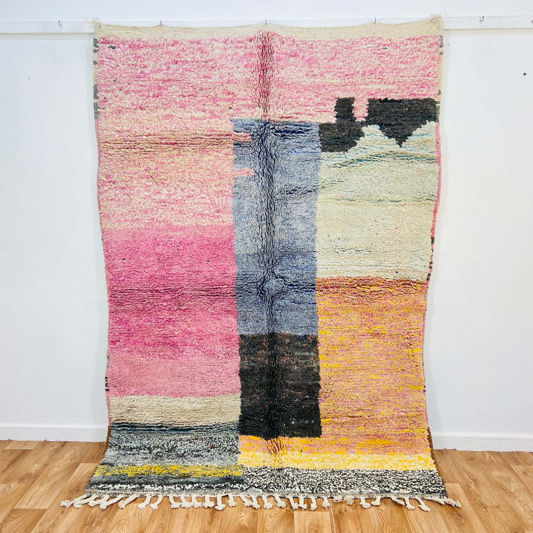 Bring bold expression into your space with this handmade vintage Moroccan wool rug, featuring wide colorblock bands in blush pink, deep gray, sun yellow, and cream. Expertly crafted by Berber artisans, this one-of-a-kind rug blends traditional weaving with a modern edge, offering both softness and visual impact. Perfect for living rooms, studios, or creative interiors.