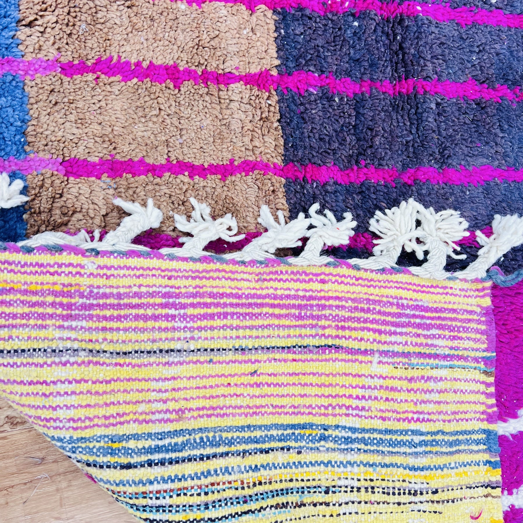 using traditional Berber techniques. Rug No. 615 features an eye-catching color block pattern with vibrant hues of fuchsia, turquoise, ochre, chocolate, and creamy white. Vertical tribal lines and playful geometric motifs create a dynamic yet harmonious feel that adds life to any space.