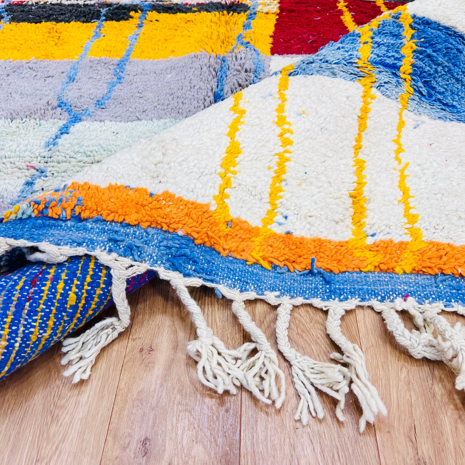 This vintage Moroccan Berber rug features a striking patchwork of vibrant color blocks and traditional diamond motifs, symbolizing protection and unity in Amazigh culture. Handwoven from soft wool, it brings both comfort and visual energy to any space. Its bold mix of reds, blues, yellows, and neutrals adds a contemporary touch while staying rooted in Moroccan tradition. Perfect for eclectic interiors, this rug is a true statement piece.