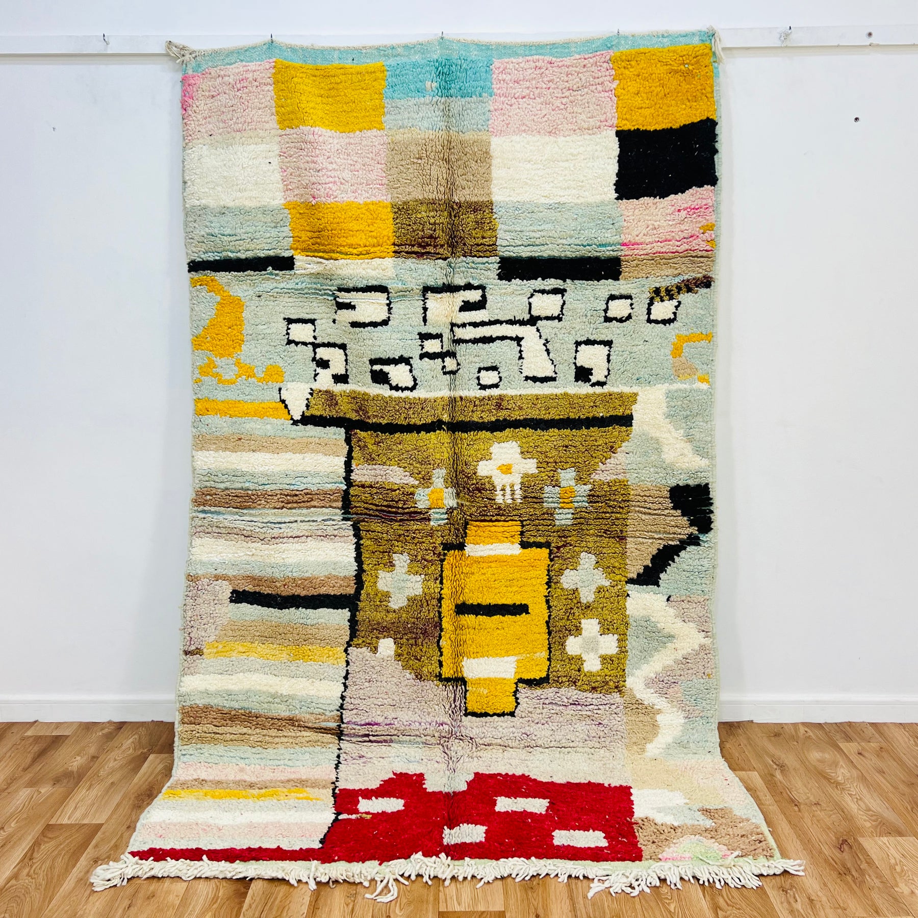 This stunning vintage Moroccan rug (Rug 428) is a true one-of-a-kind piece, handwoven by Berber artisans using traditional techniques passed down through generations. It features an eclectic design of abstract tribal motifs, pixelated squares, and geometric shapes in a bold palette of mustard yellow, rich red, pastel pink, sky blue, black, and ivory. The central rectangular pattern gives it the look of an ancient symbol or doorway, adding mystery and cultural depth.