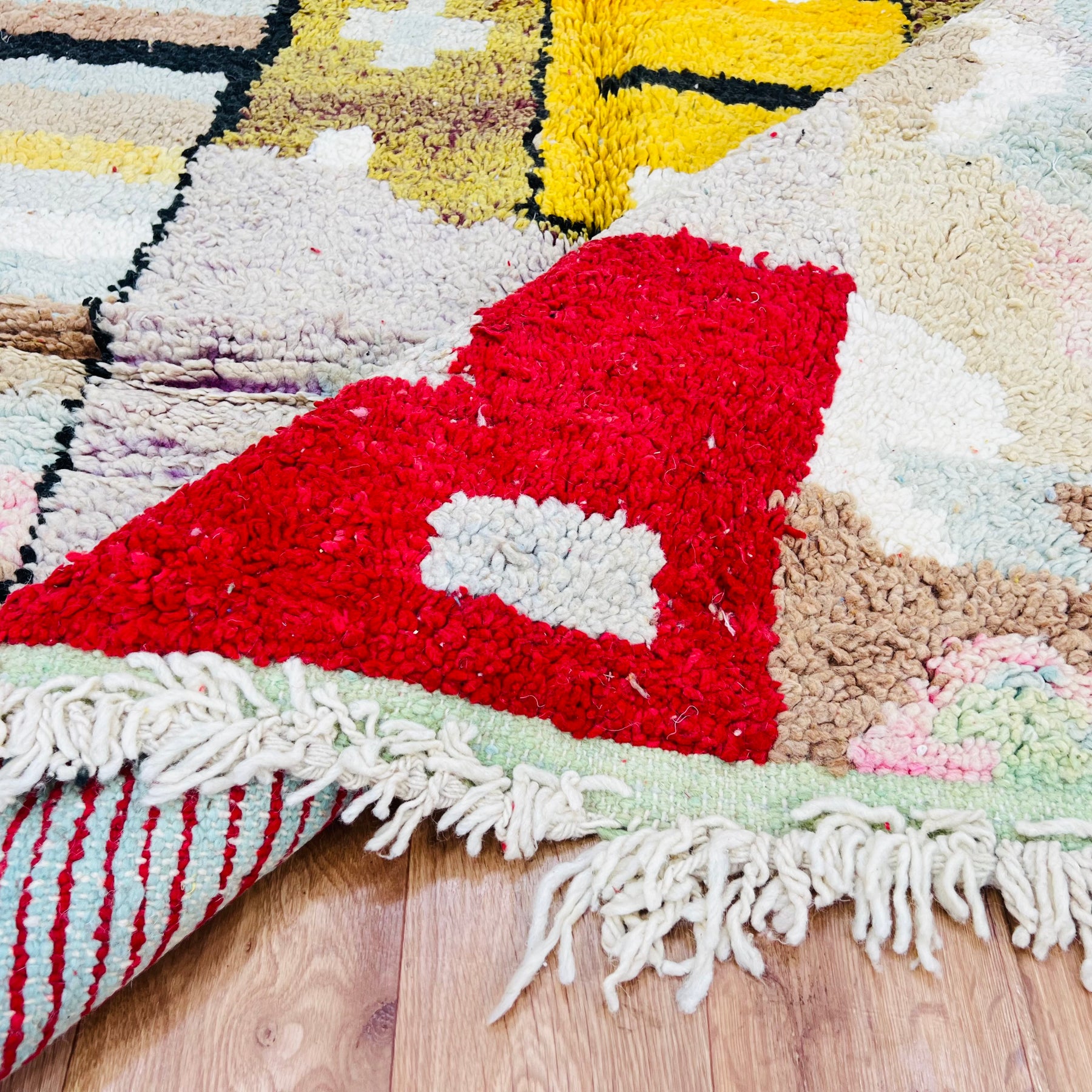Fringe: Traditional hand-knotted fringes on one side