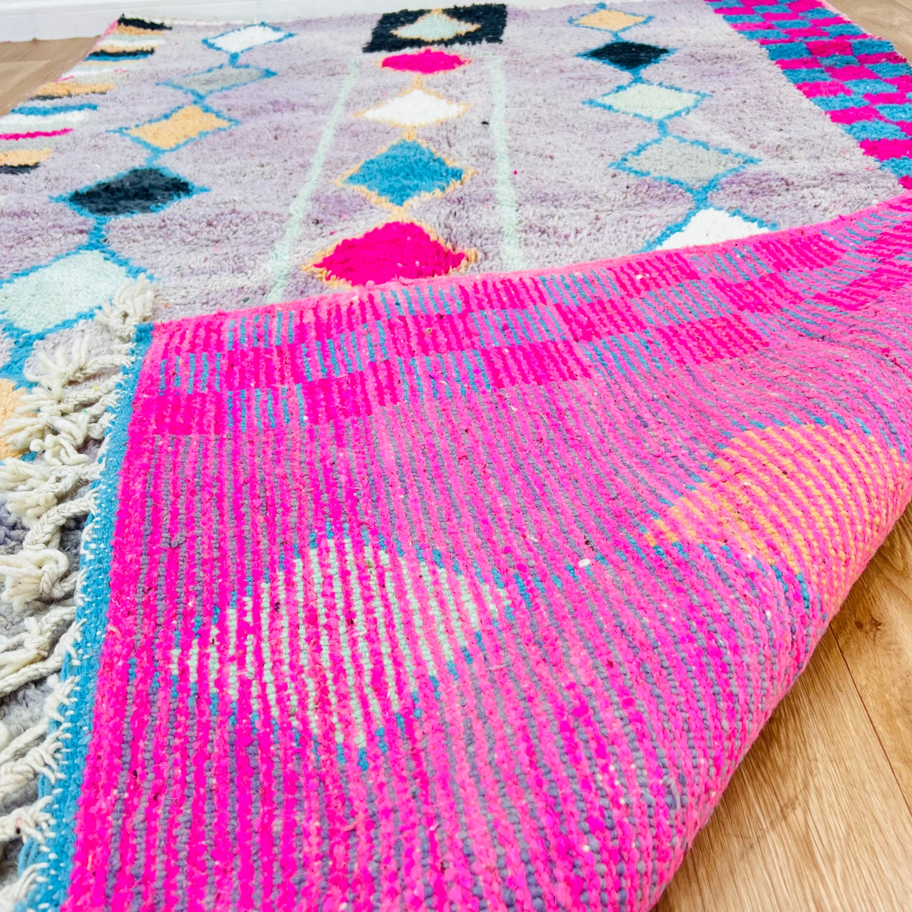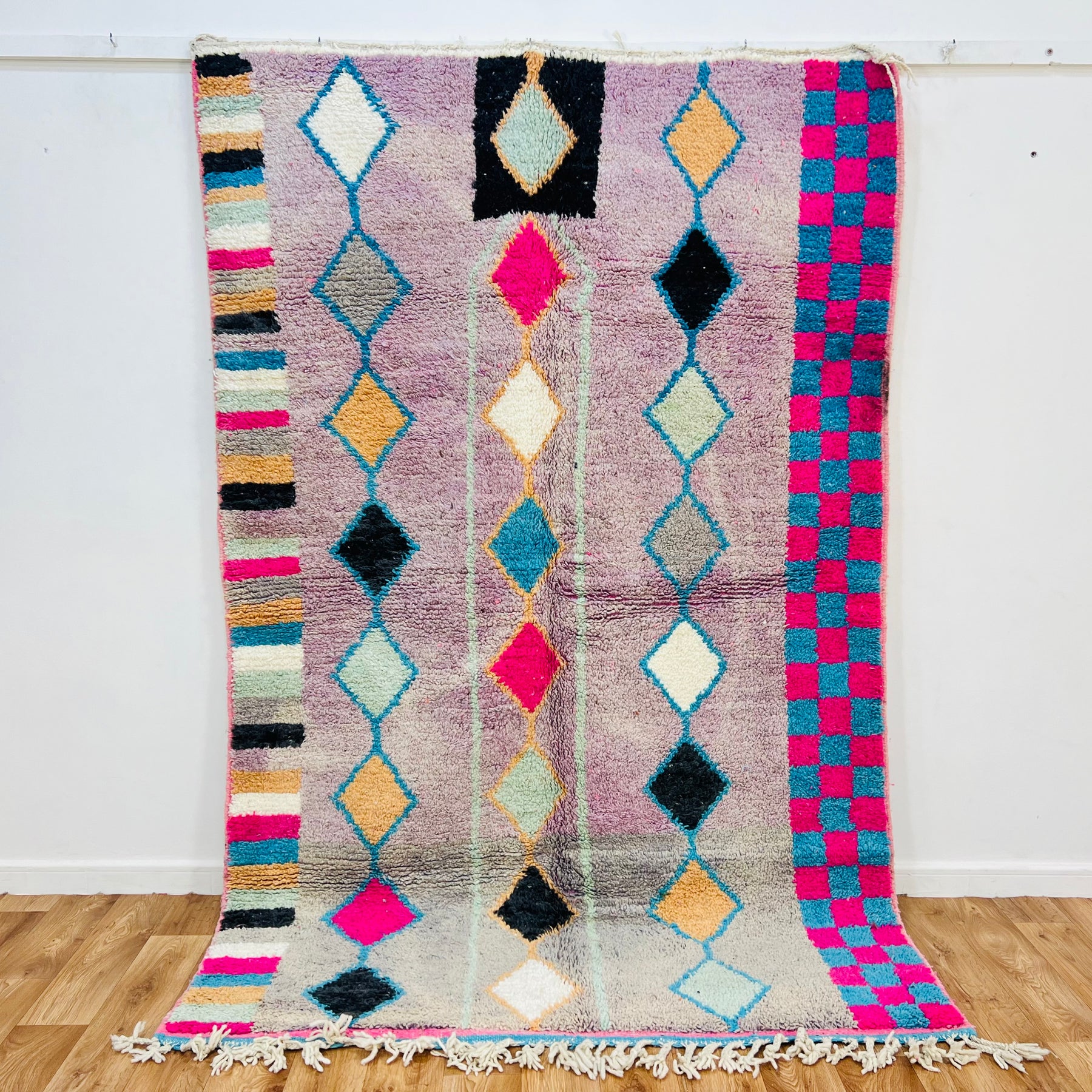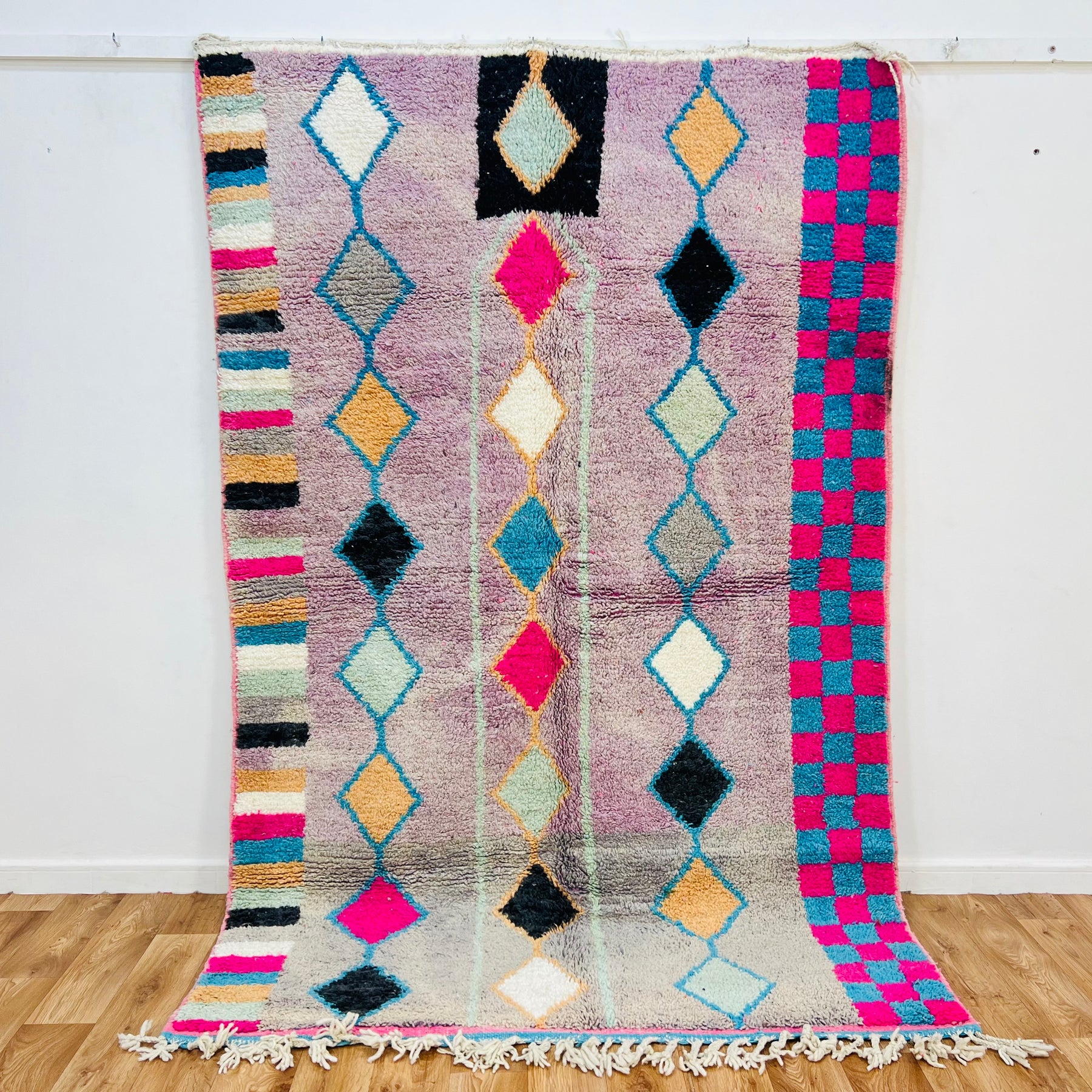 Bring home a piece of Moroccan artistry with this one-of-a-kind vintage rug, handmade by Berber women in the Atlas Mountains. Rug No. 451 features bold vertical rows of diamond motifs woven on a lavender base, framed by striking checkerboard and striped borders in vibrant pink, blue, white, and ochre tones. Its plush wool texture and geometric layout make it a perfect centerpiece for any modern, eclectic, or boho-style interior.