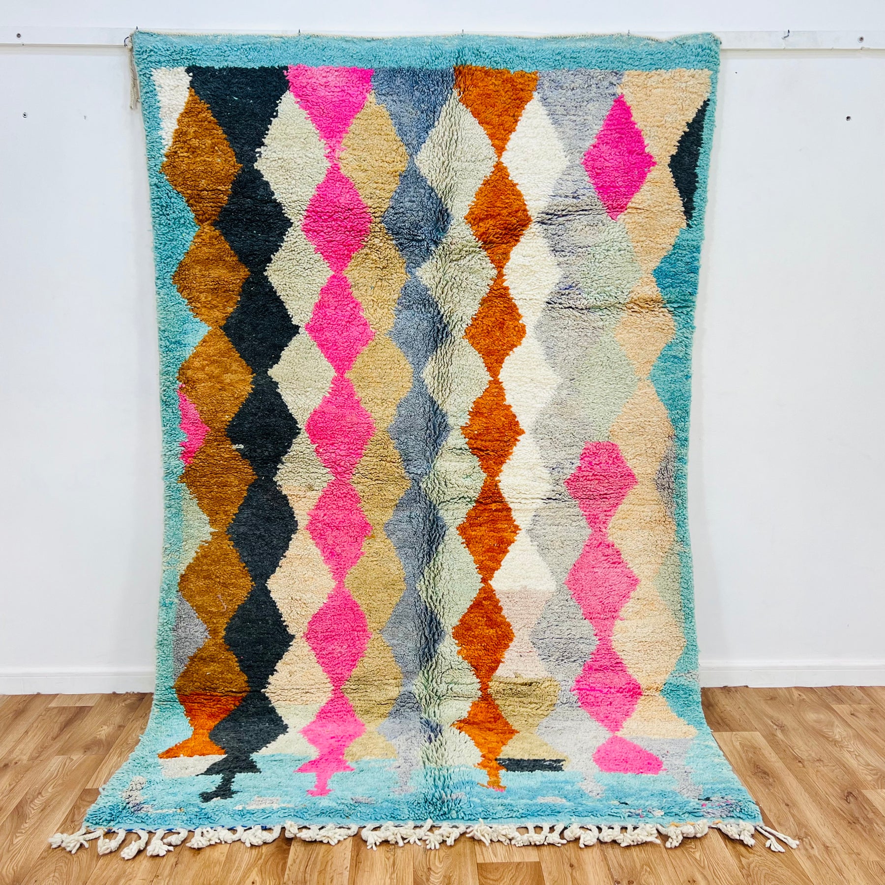 Rug 471 is a stunning vintage Moroccan wool rug featuring a bold all-over diamond pattern in hues of pink, terracotta, charcoal, beige, and turquoise. Framed by a soft blue border and hand-knotted by Berber artisans, this design radiates balance, tradition, and color harmony.