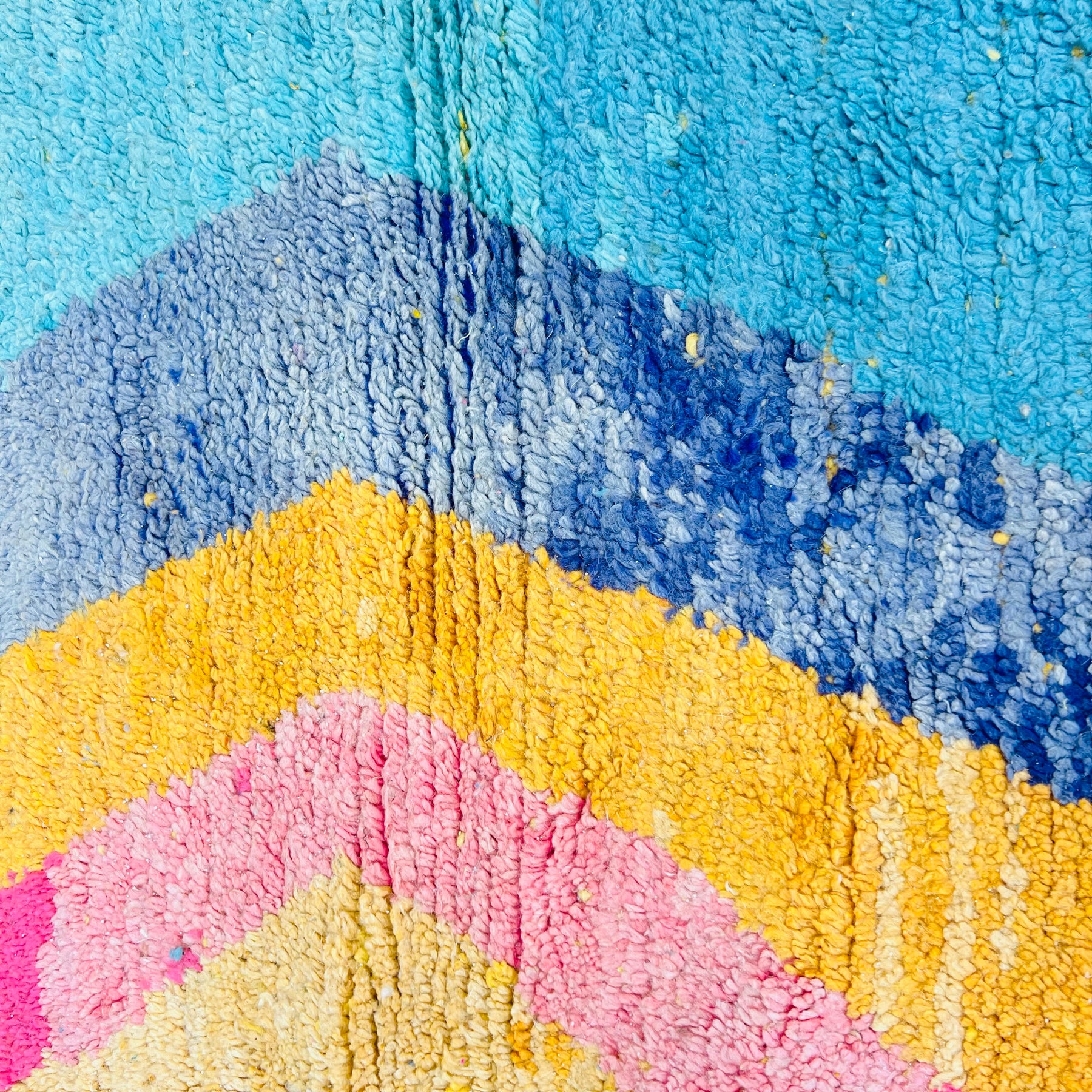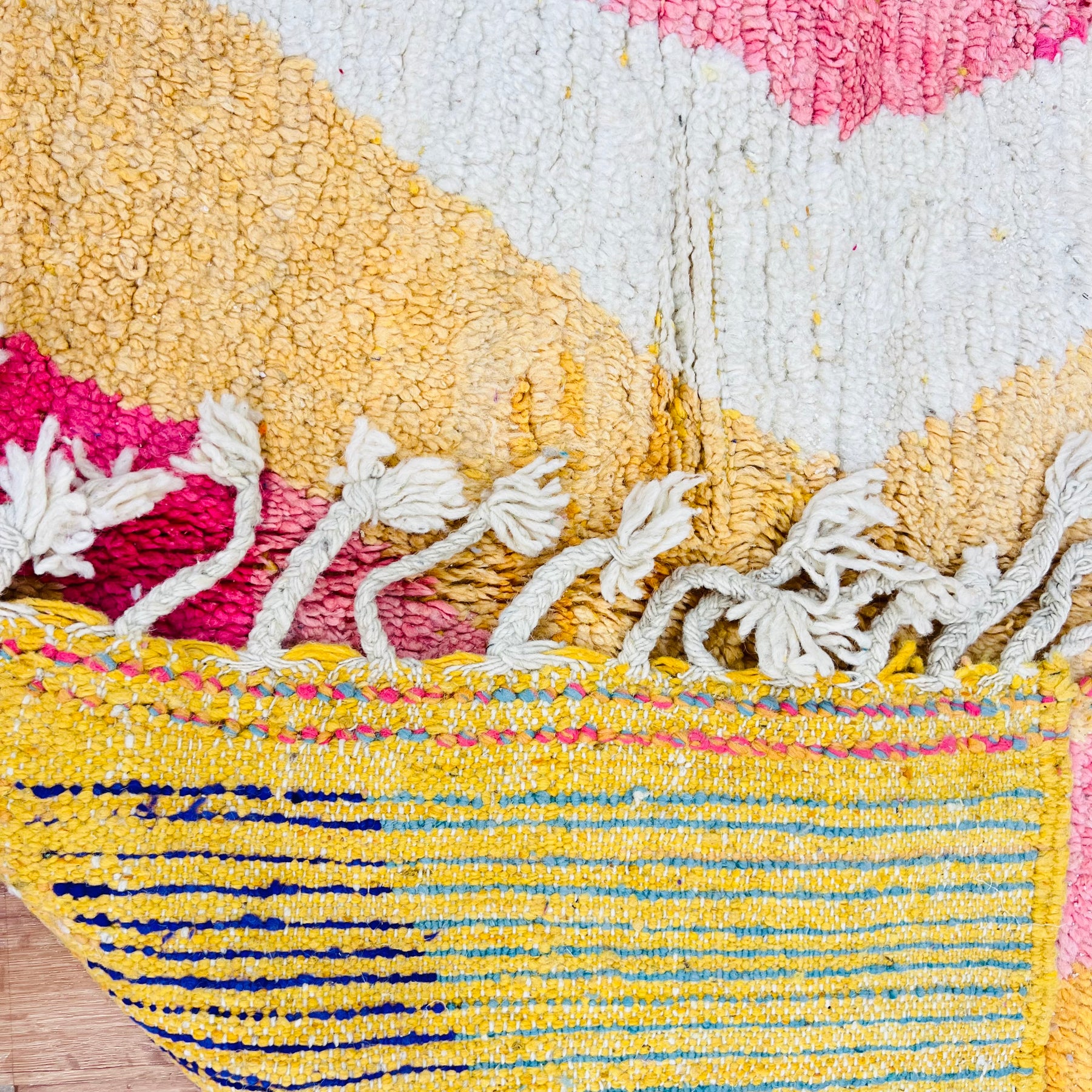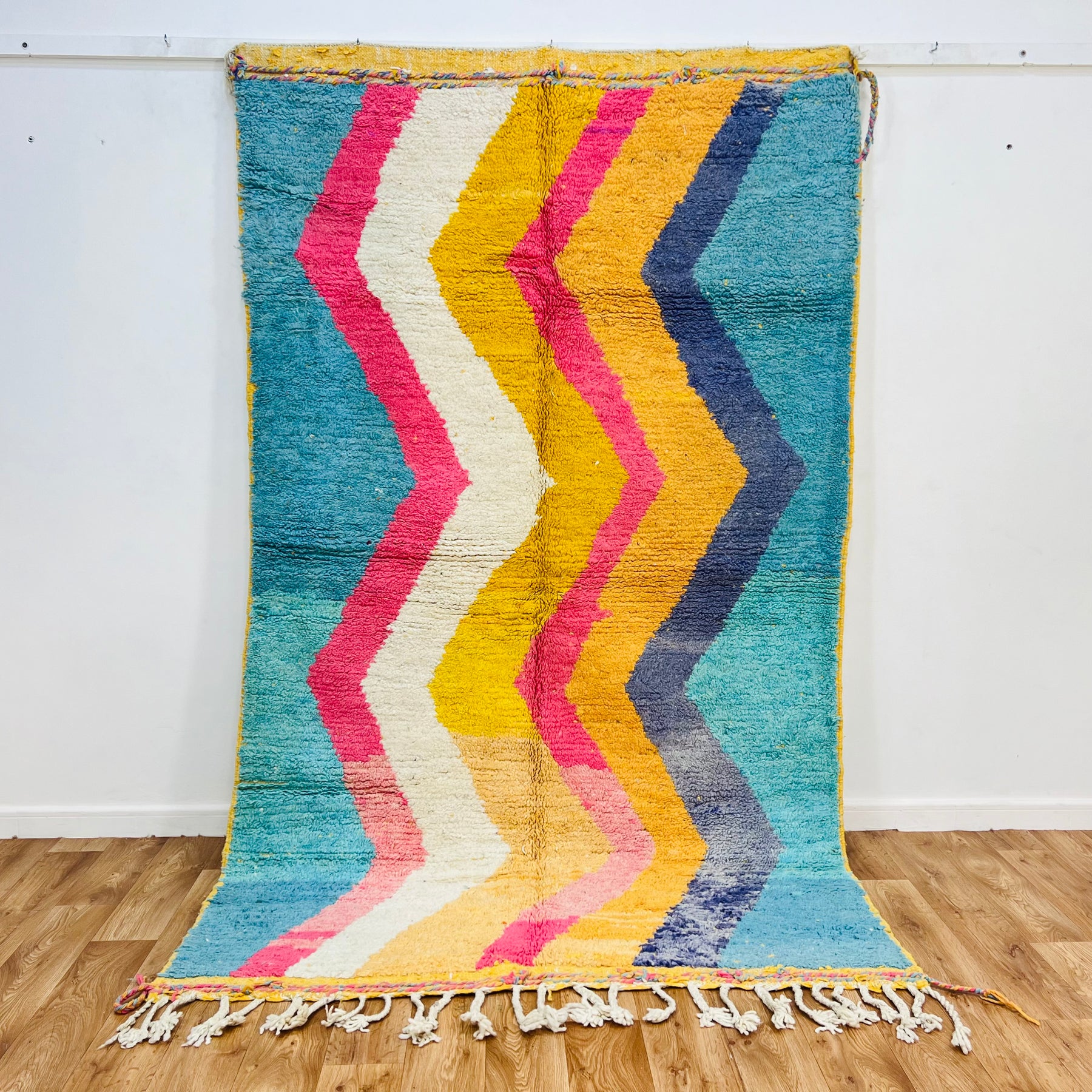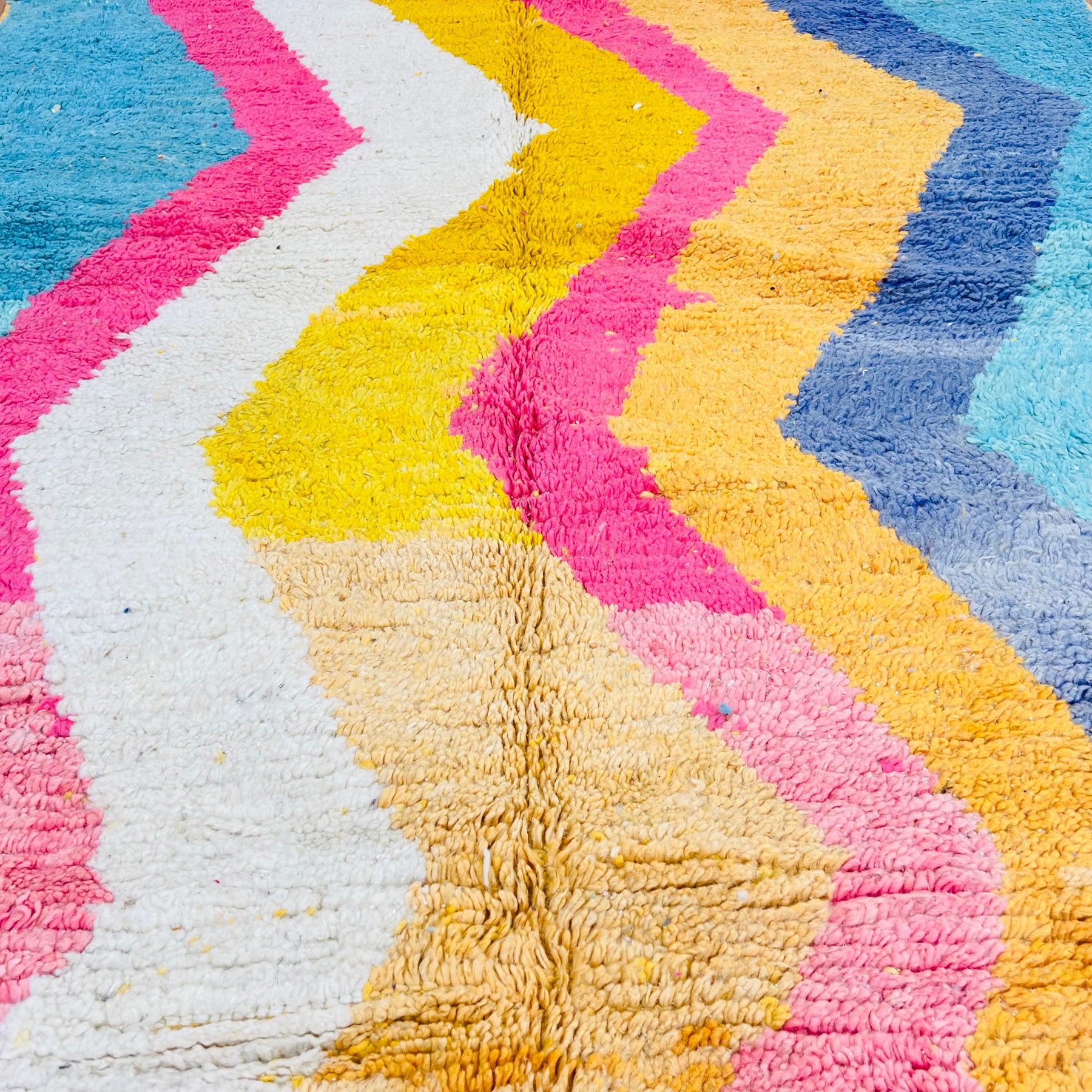 Bring a burst of joy to your space with this vibrant handmade Moroccan shag rug featuring bold zigzag patterns in turquoise, pink, mustard, cream, and navy. Carefully woven by skilled artisans, this one-of-a-kind rug adds a playful and artistic flair to any room.