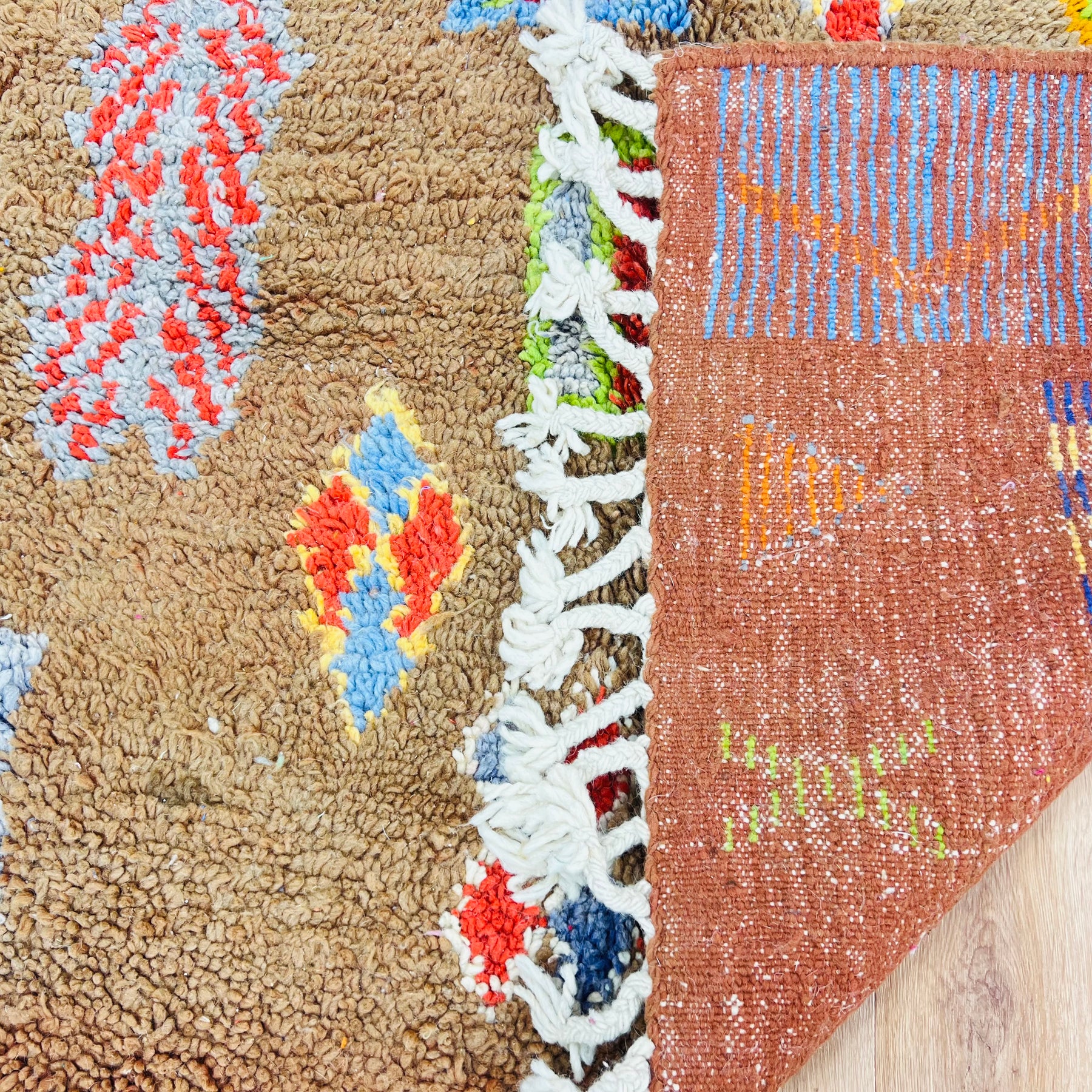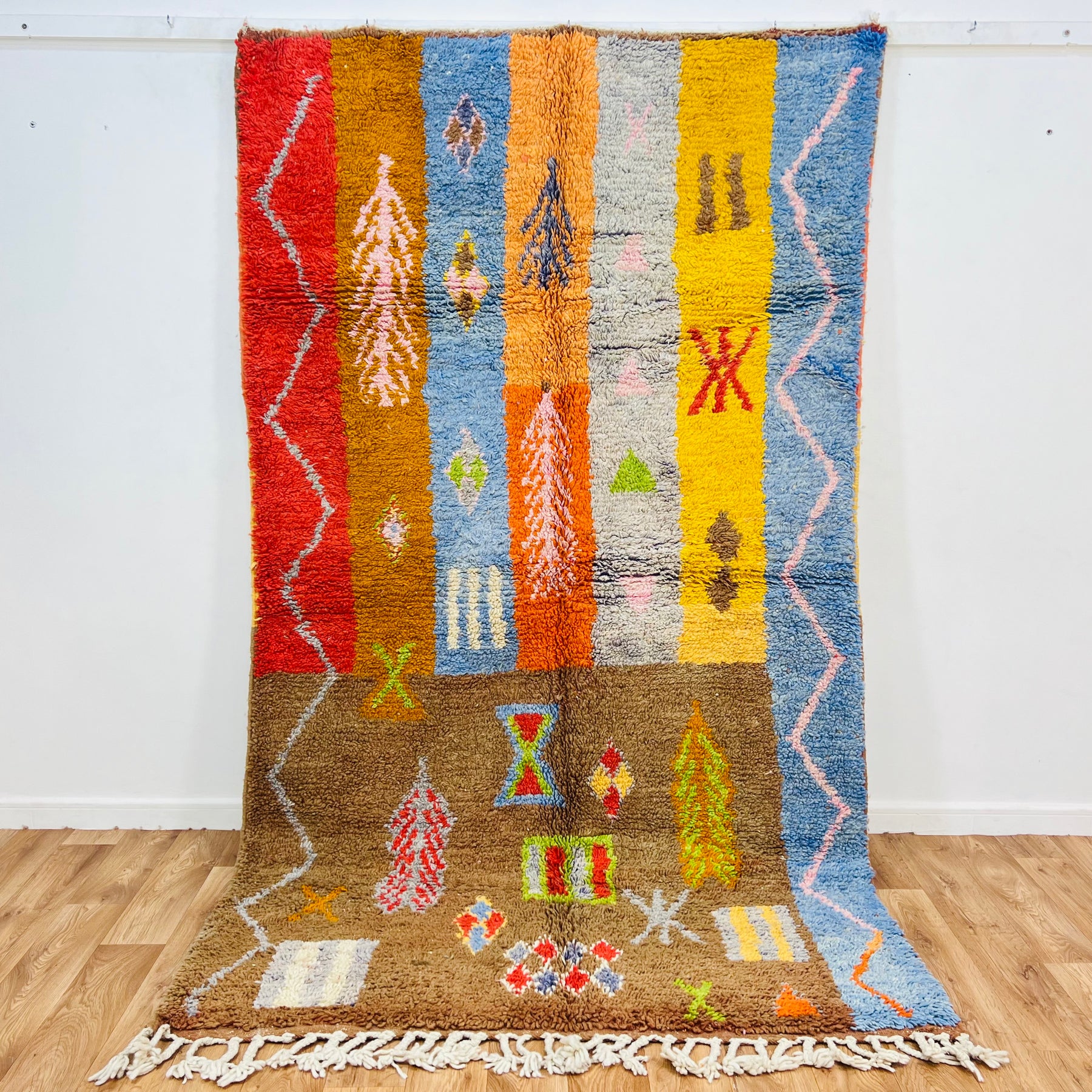 Bring vibrant storytelling to your space with this handmade vintage Moroccan rug (Rug No. 505). Featuring a lively patchwork of Berber symbols, trees, diamonds, and abstract motifs in earthy tones of brown, red, yellow, blue, and orange, it tells a tale of cultural heritage through its bold design. Handwoven by Berber artisans, this one-of-a-kind rug is a striking centerpiece.