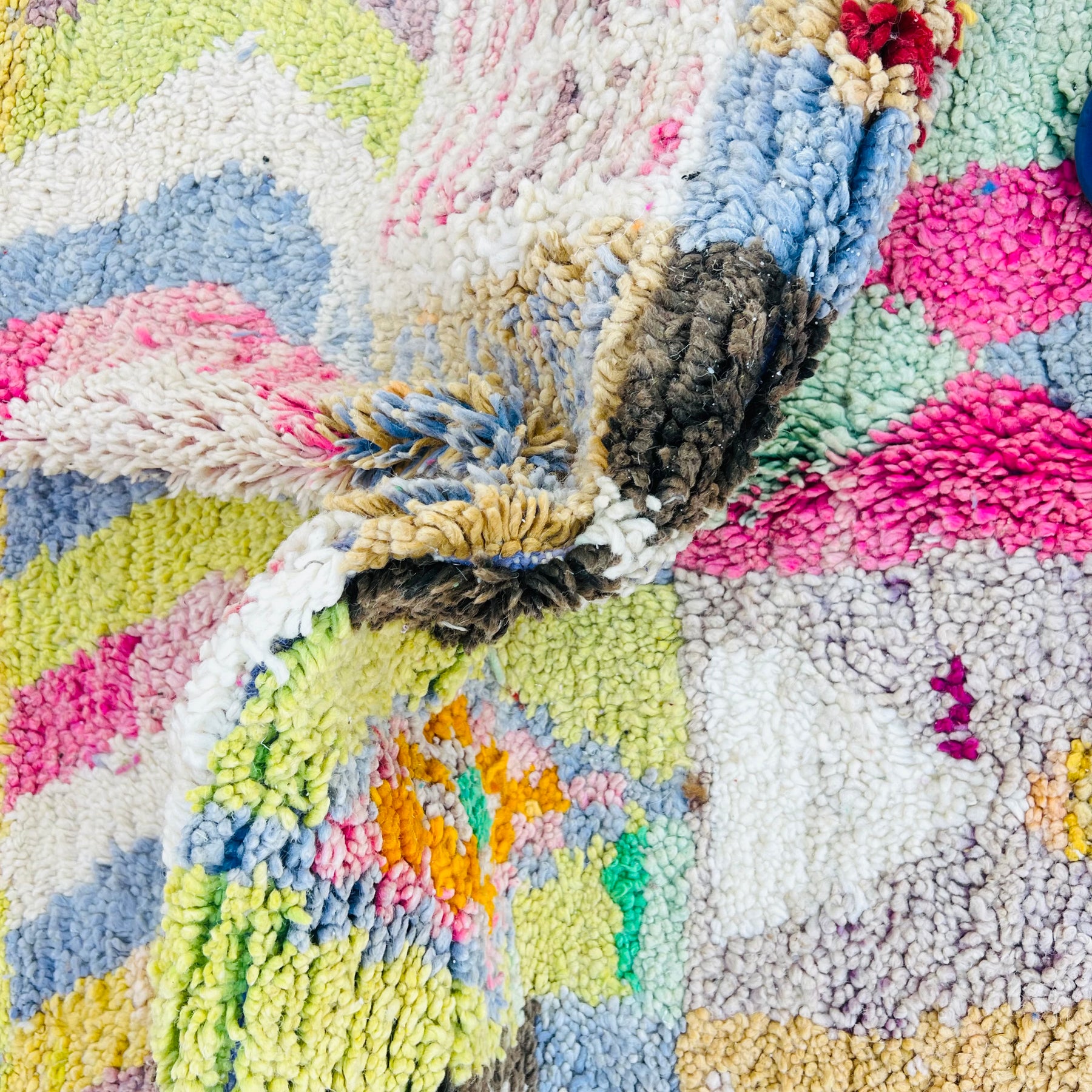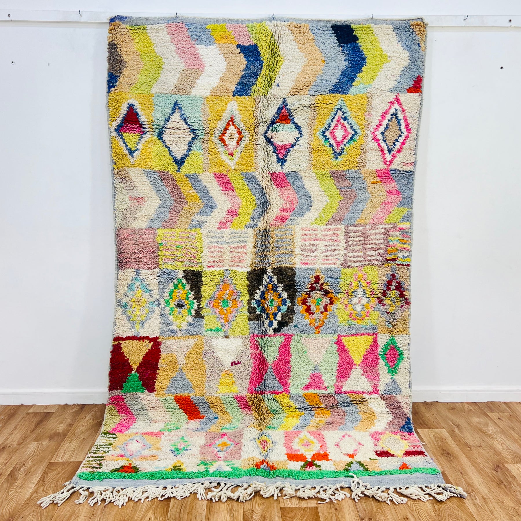 Rug 507 is a vibrant vintage Moroccan rug woven with an explosion of color, texture, and symbolism. Crafted by Berber women using traditional techniques, this rug features rows of multicolored tribal motifs, zigzags, diamonds, and checkerboard patterns in soft pastels and bold brights.
