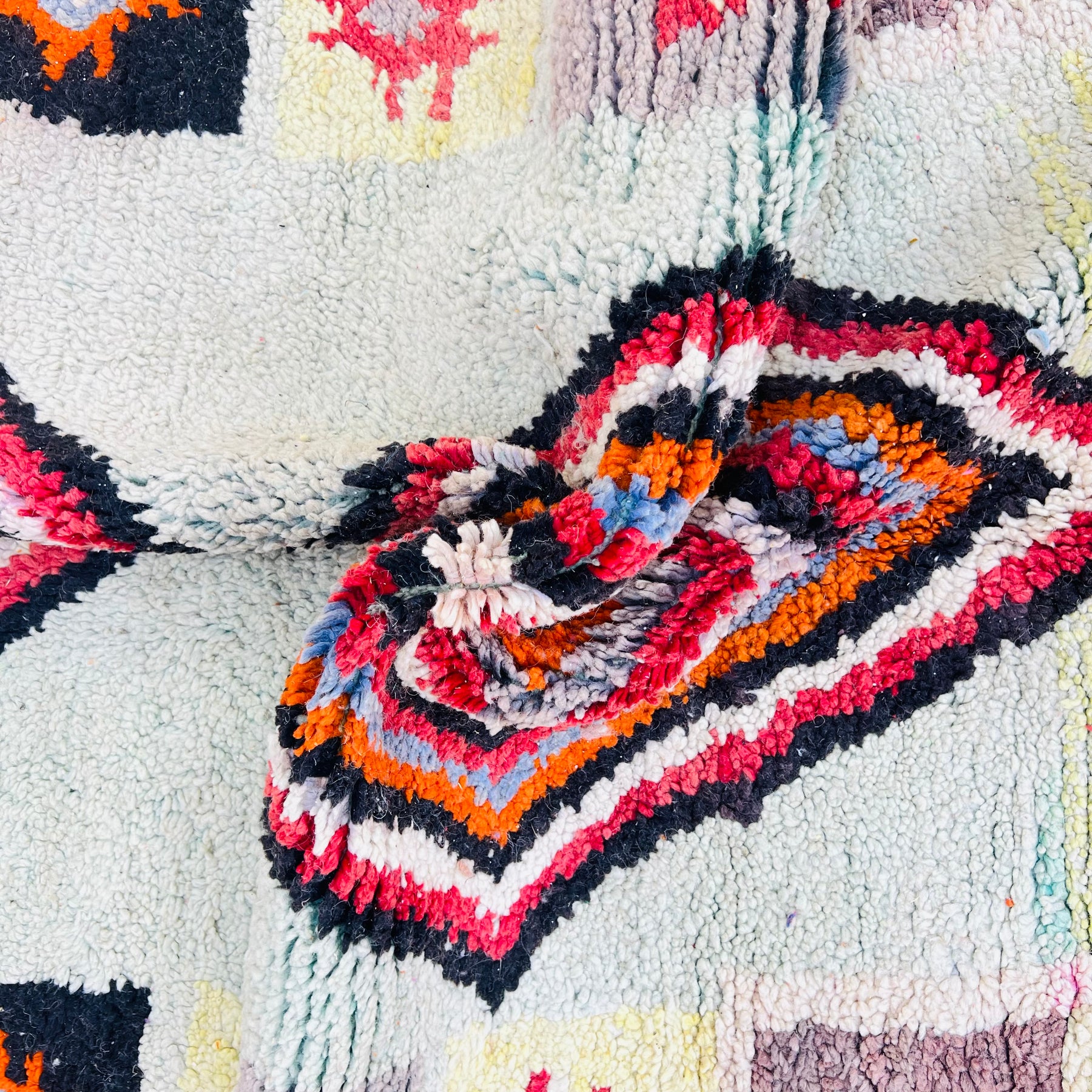 Add bold character to your space with this handmade vintage Moroccan rug, featuring a powerful diamond pattern at the center surrounded by vibrant geometric star motifs. The rug’s palette mixes deep orange, red, black, and cream tones, making it a striking piece for any interior. Carefully handwoven by Berber artisans using soft wool, it reflects centuries-old Moroccan craftsmanship.
