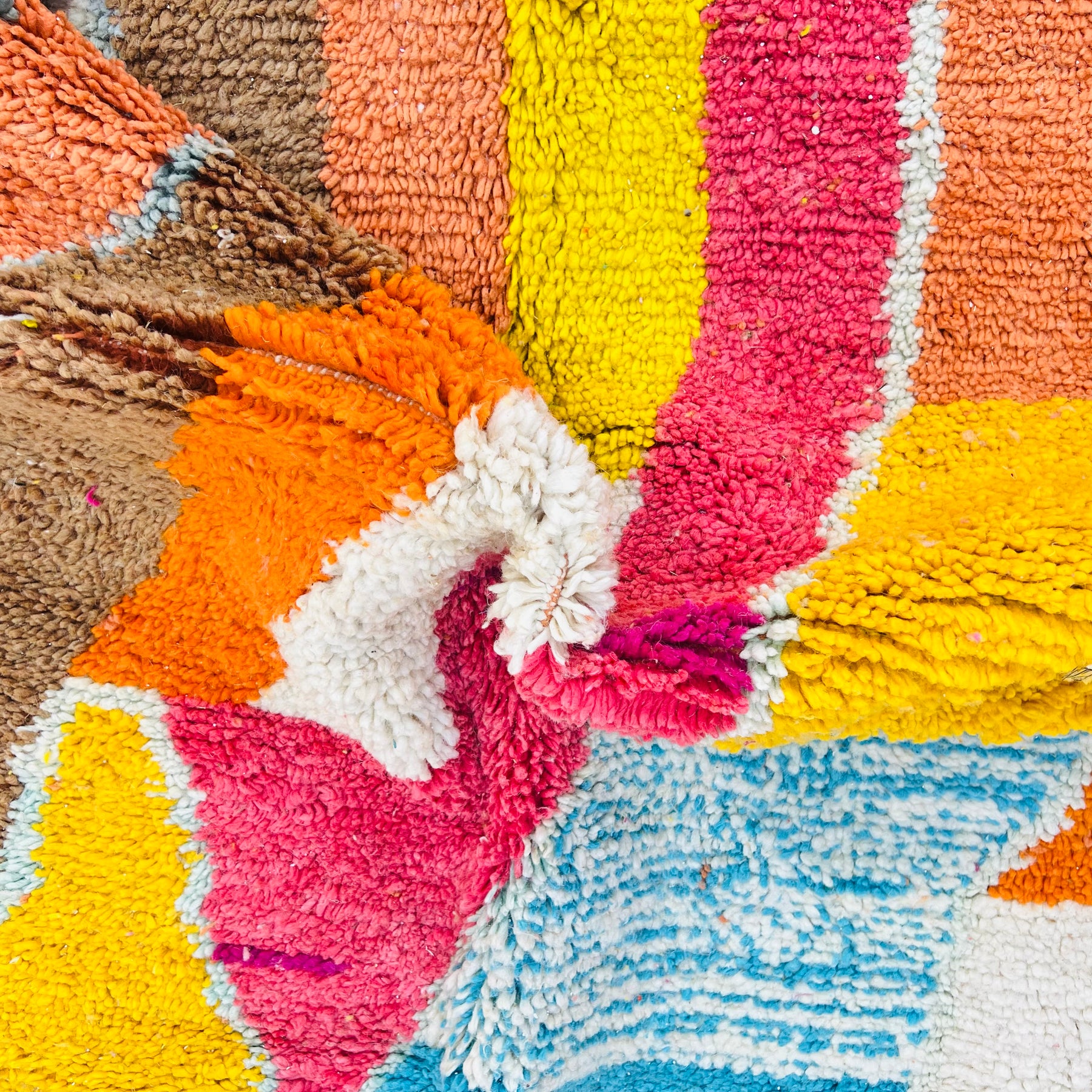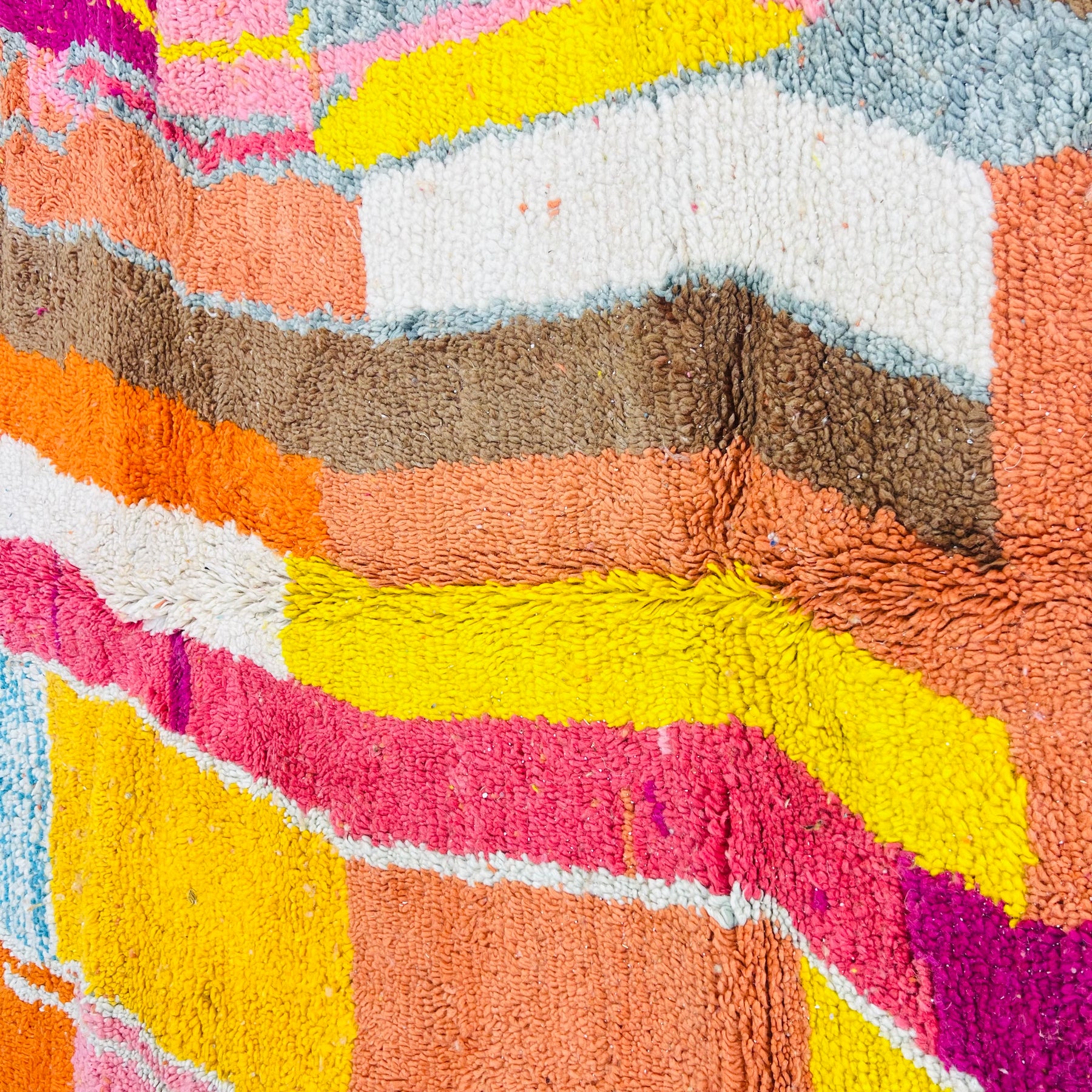 Handwoven with bold geometric blocks and abstract patterns, this vintage Moroccan rug brings an energetic burst of color into your home. Featuring vivid shades of magenta, turquoise, yellow, orange, brown, and cream, its modernist design is inspired by tribal artistry and artistic expression. Crafted with natural wool and soft to the touch, this piece is ideal as a living room centerpiece or to brighten up a creative studio.