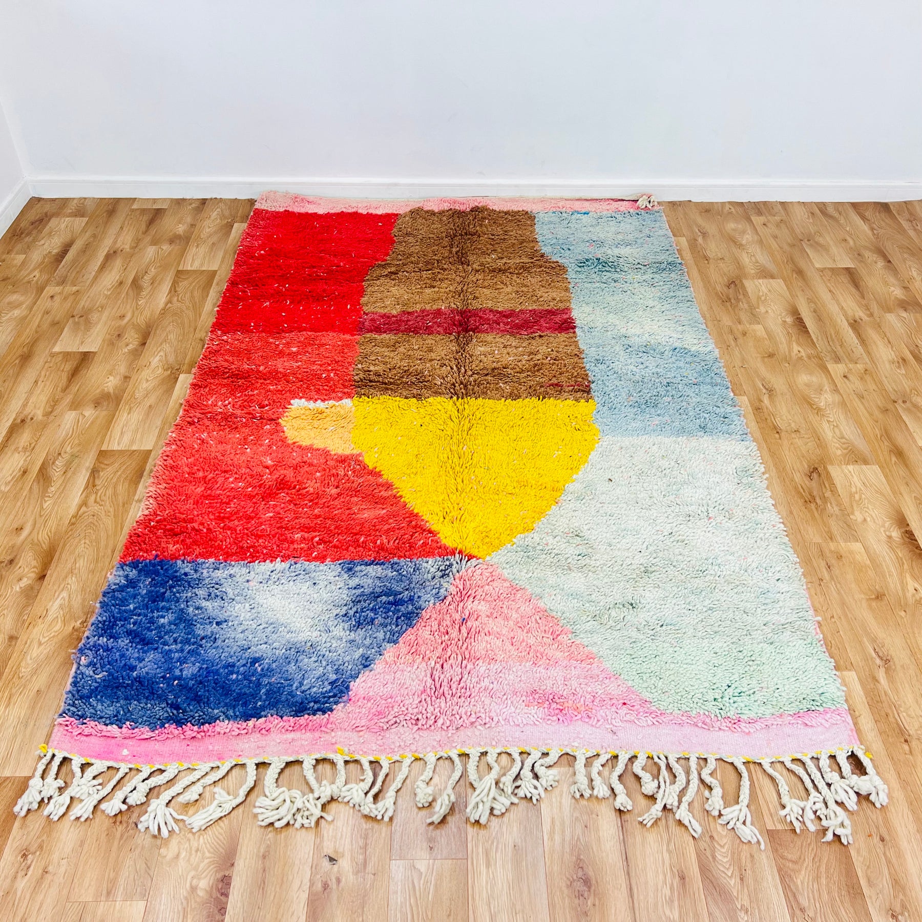 Bring a touch of vibrant elegance to your space with this handmade vintage Moroccan rug featuring a soft pink base, diamond motifs, and cheerful tones of yellow, green, navy, and purple. Carefully woven using 100% wool by Berber women in Morocco, this artistic piece blends playful design with cultural heritage.