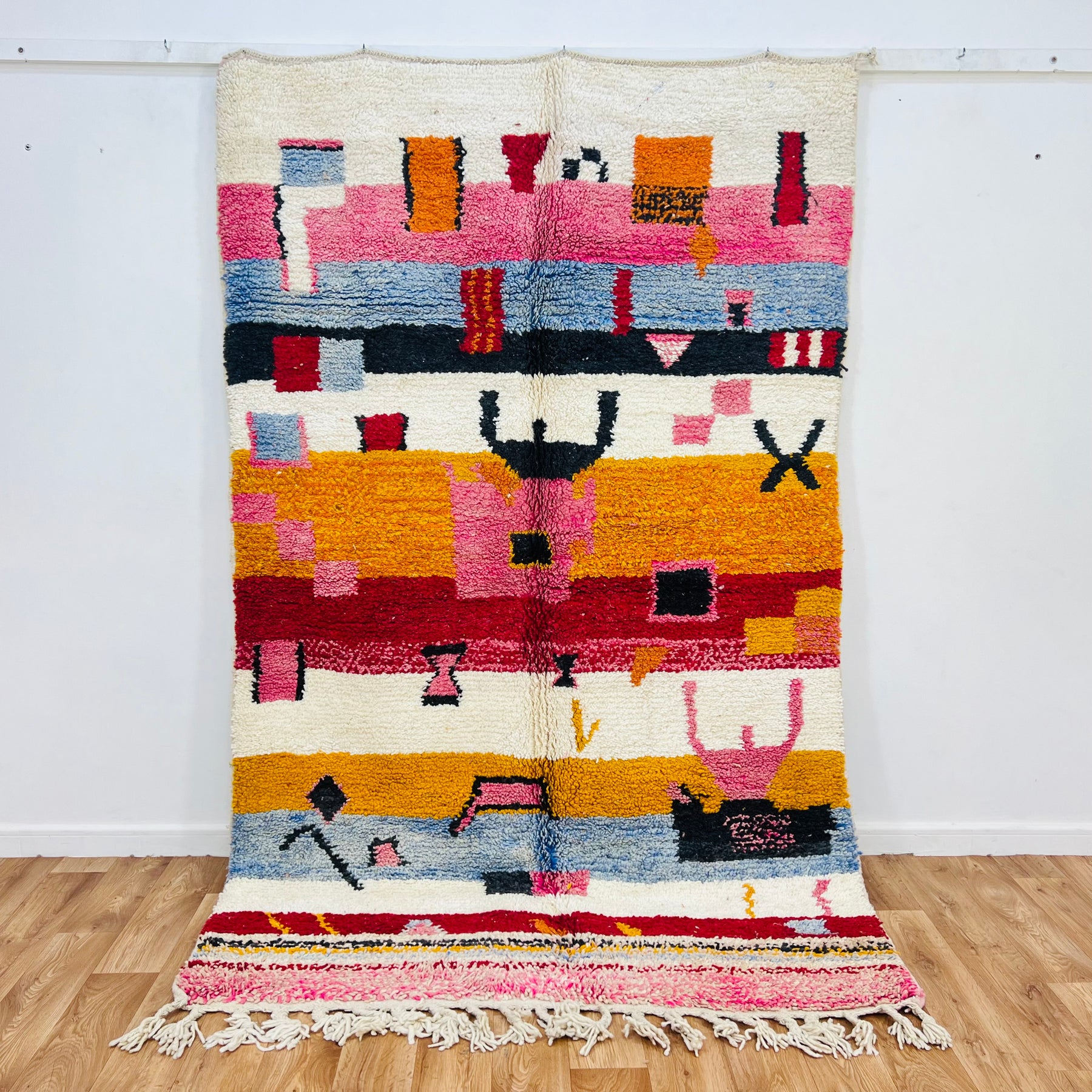 Rug 527 is a striking vintage Moroccan rug that blends Berber symbolism with a playful modern palette. Featuring vibrant horizontal color bands in red, orange, pink, and blue, this handwoven wool piece is decorated with abstract tribal shapes and traditional symbols.