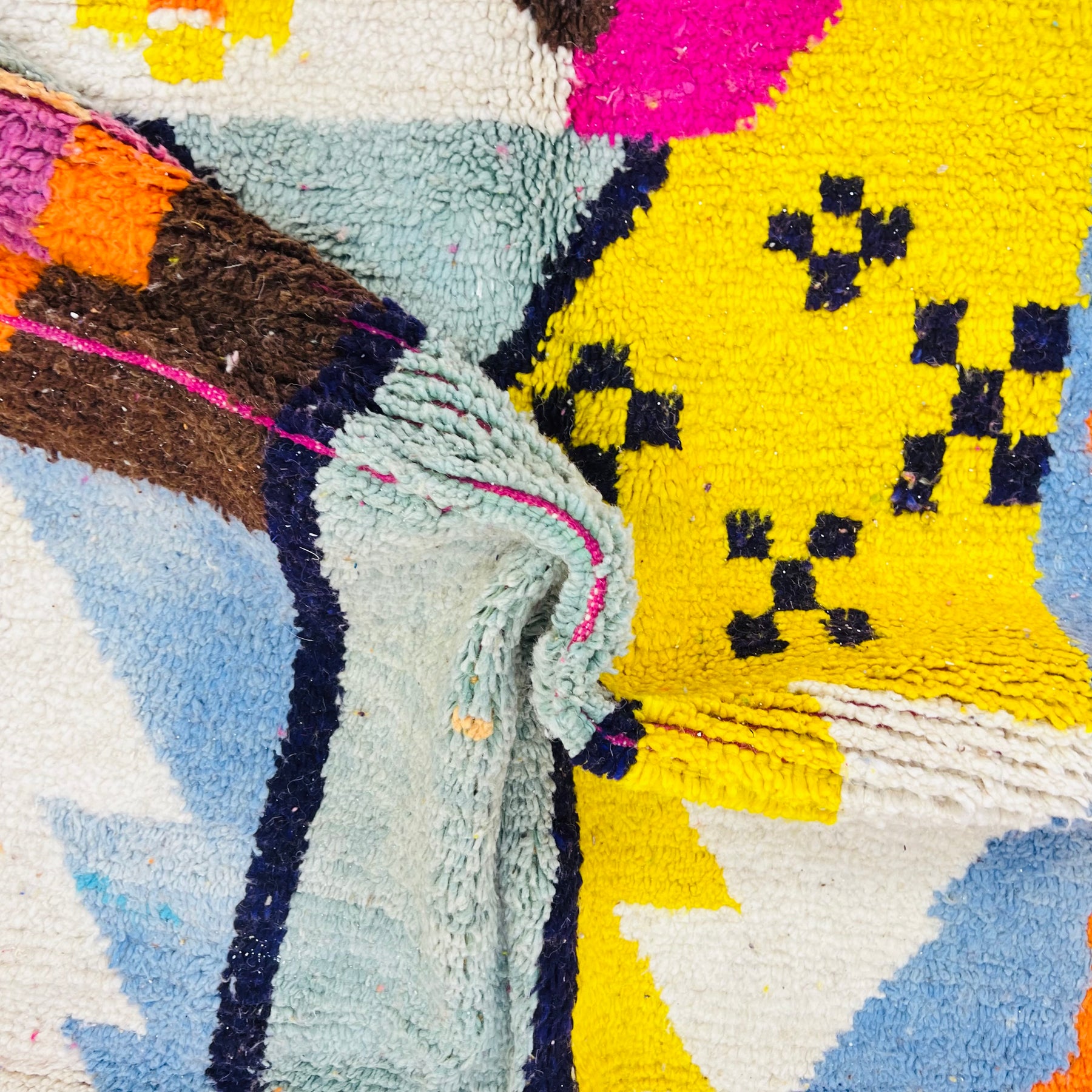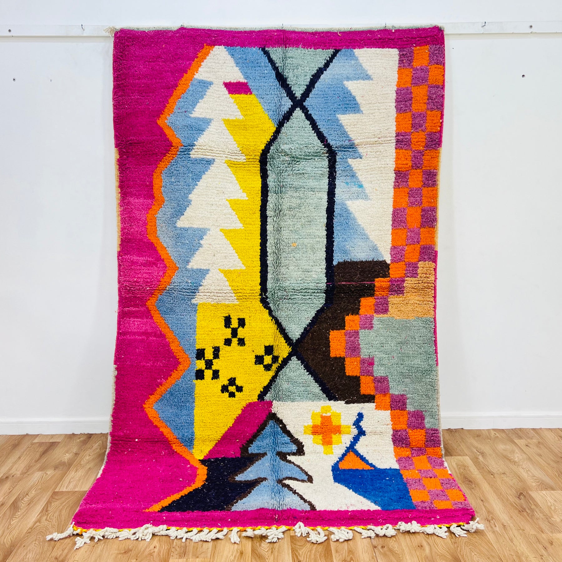 Bring your space to life with this one-of-a-kind vintage Moroccan rug (Rug 533), featuring a bold abstract composition and playful Berber symbolism. Handwoven with premium wool, this piece showcases a stunning combination of magenta, yellow, sky blue, burnt orange, and black in geometric motifs and symbolic patterns representing trees and tribal expressions. Its energetic palette and hand-knotted texture make it a vibrant statement for bohemian, modern, or eclectic interiors.