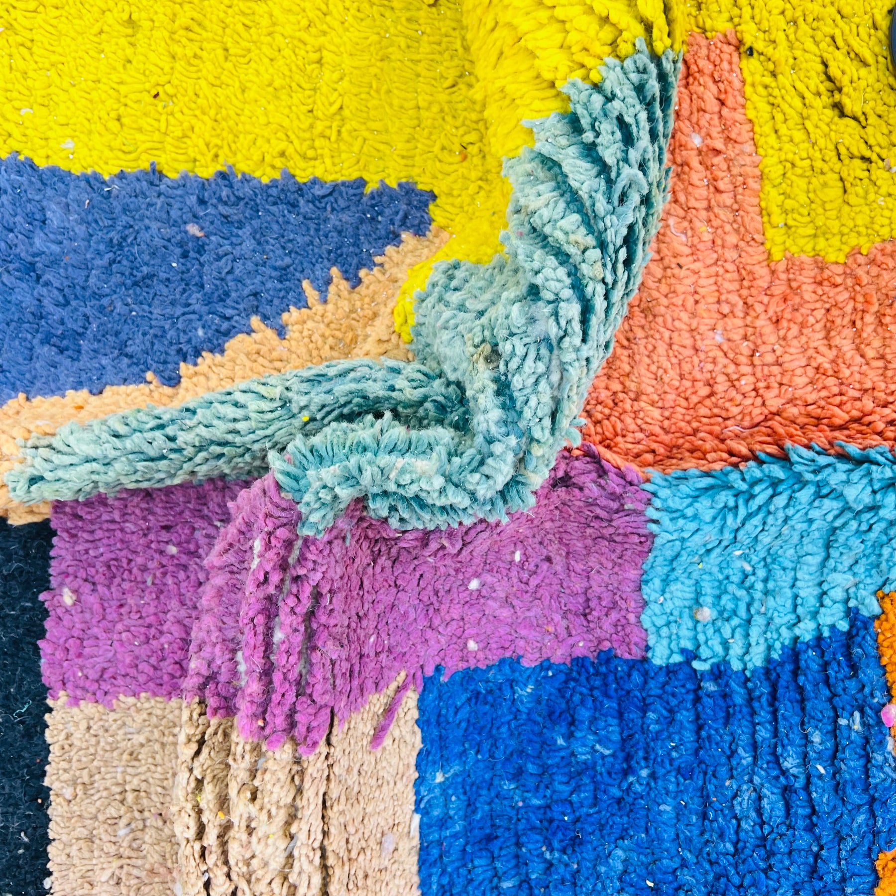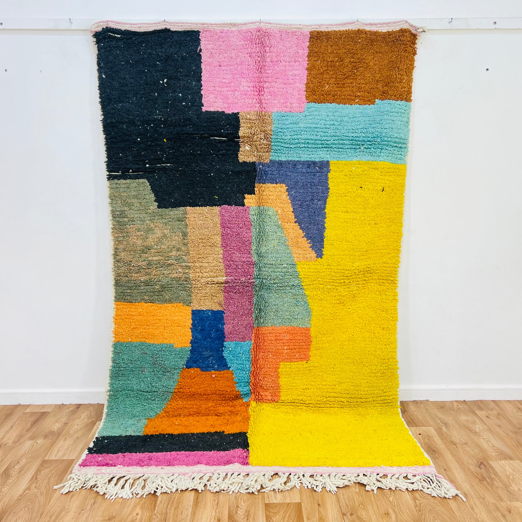 Rug 537 is a bold vintage Moroccan wool rug crafted with an abstract color block design. Handwoven by Berber artisans, this rug features a vibrant fusion of yellow, black, pink, blue, orange, green, and beige — a celebration of color and craftsmanship in perfect harmony.