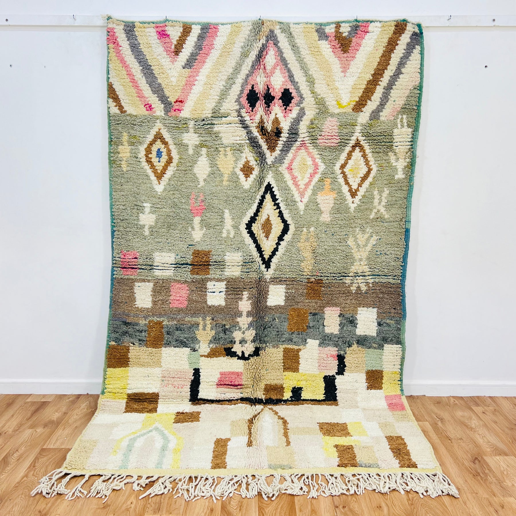 Introduce timeless character to your home with this vintage Moroccan rug, handmade by Berber artisans. Featuring a soothing palette of olive green, blush pink, mustard, and ivory, this piece showcases layered geometric diamonds and abstract tribal symbols—each telling a story of heritage and craftsmanship. Its medium pile offers both softness and durability, perfect for adding warmth to living rooms, bedrooms, or creative spaces.