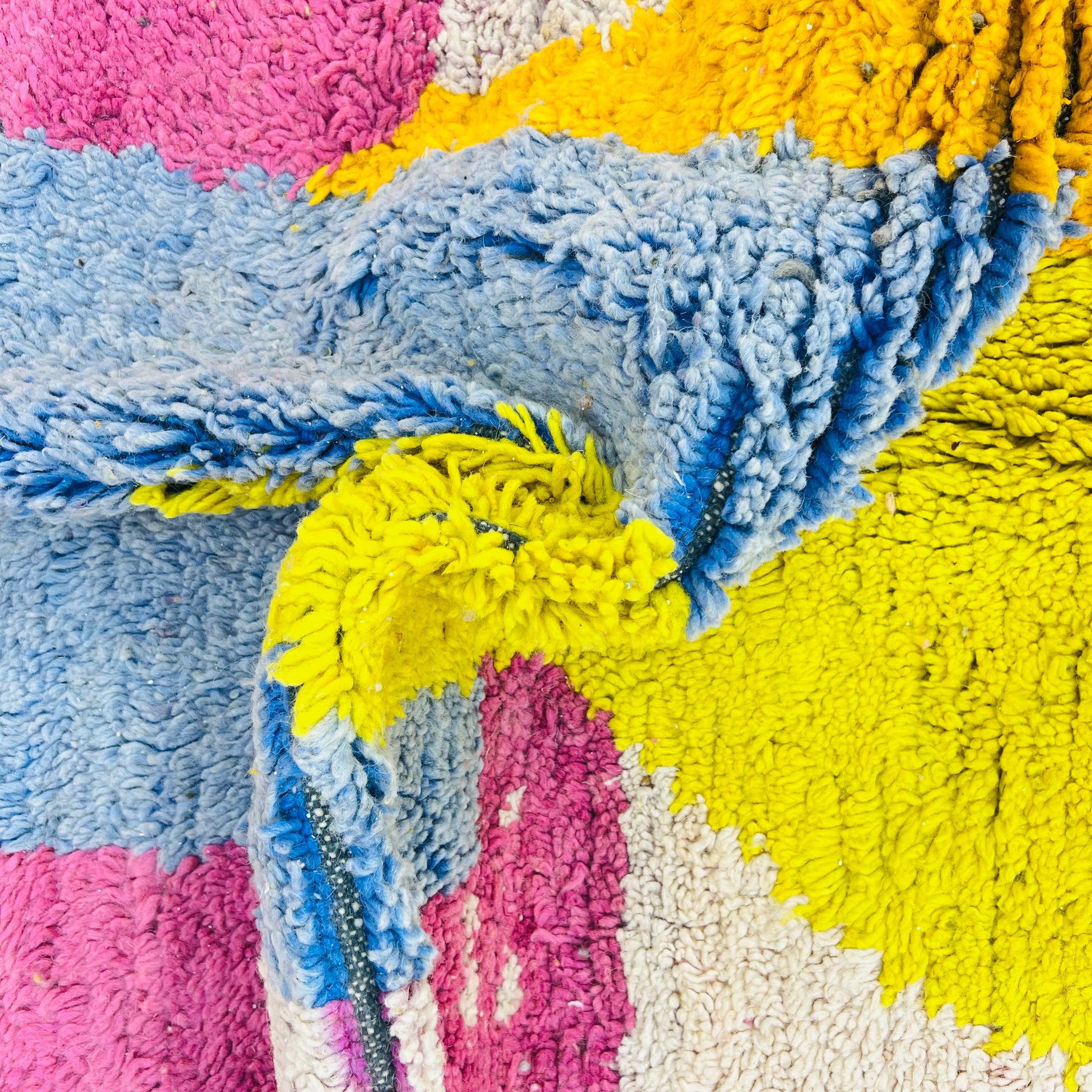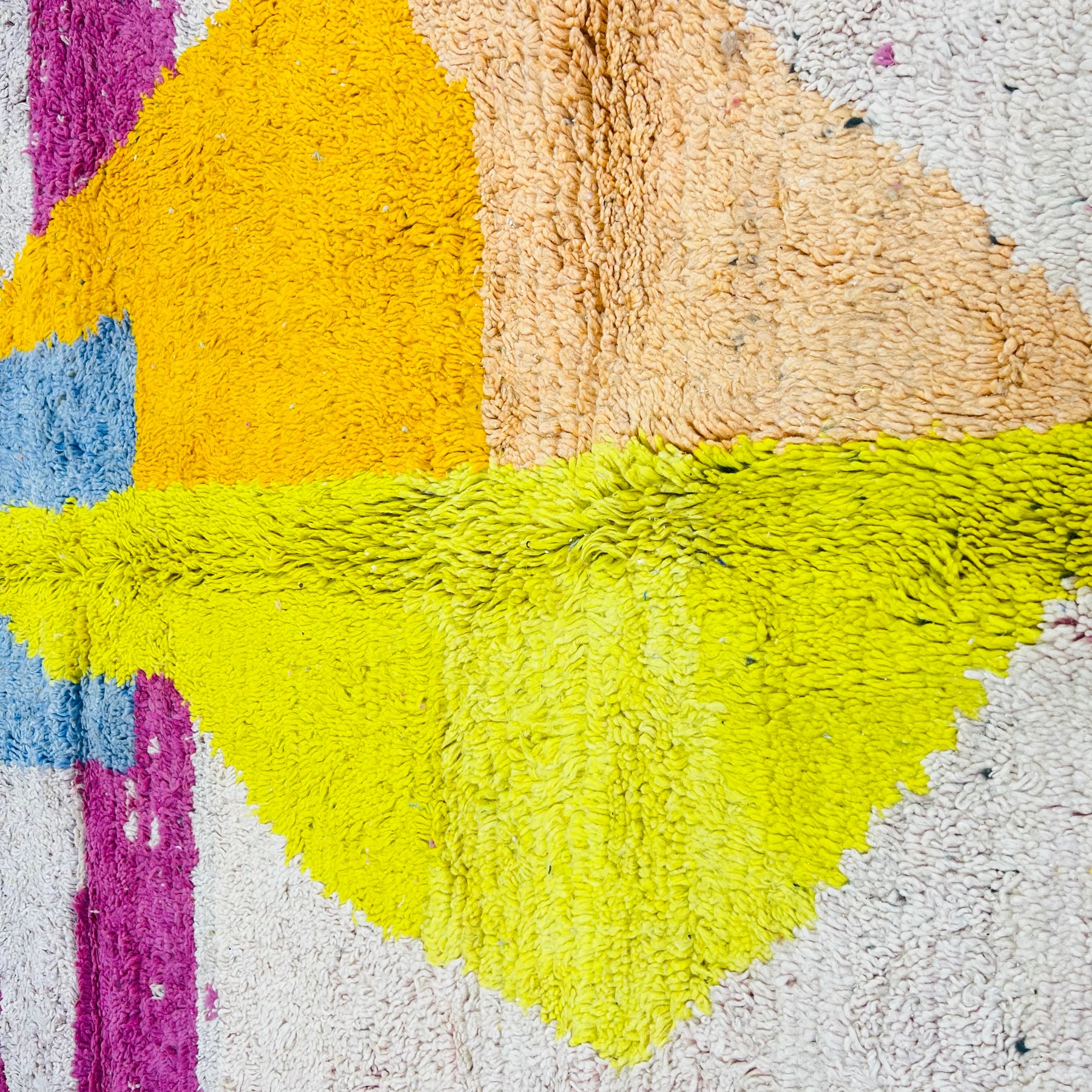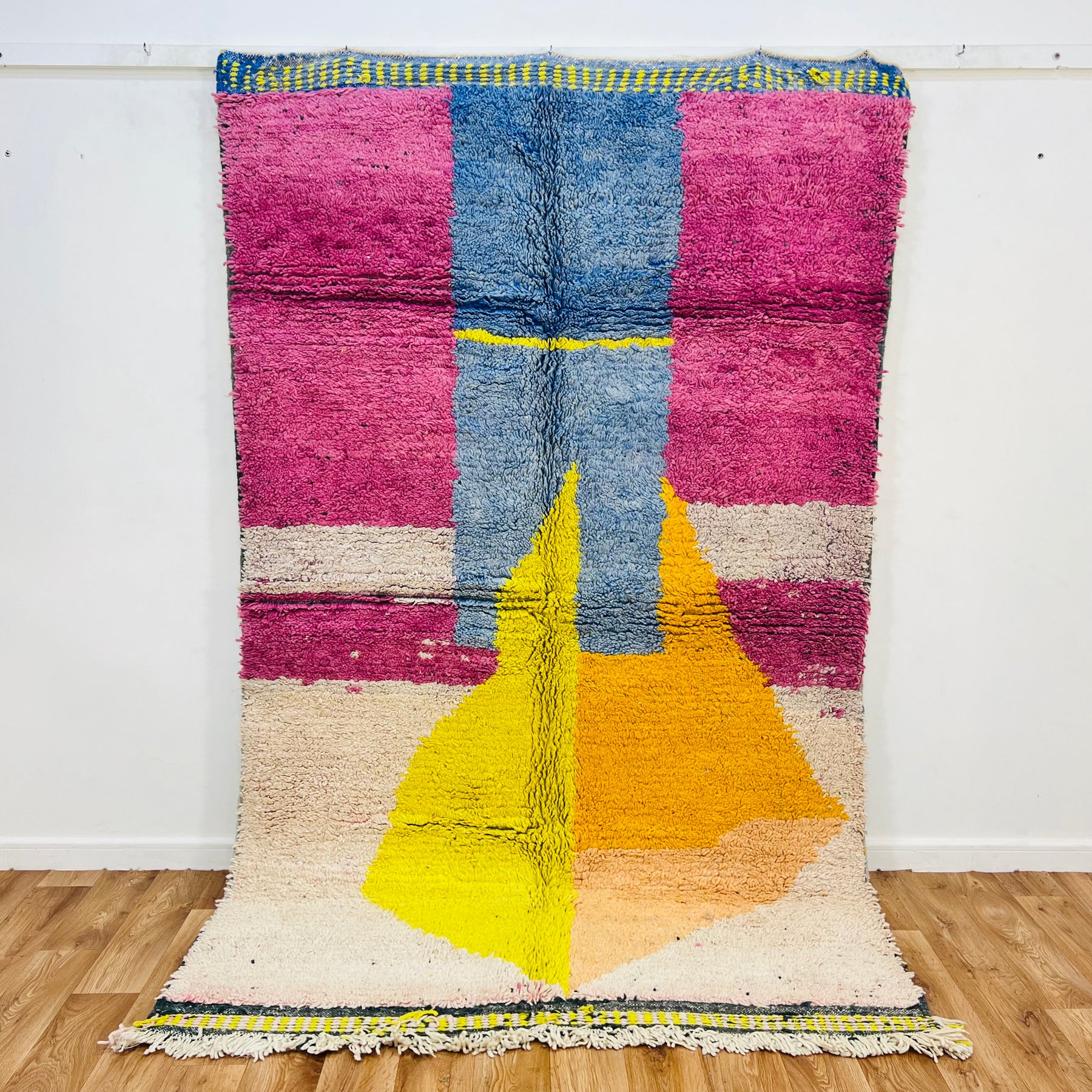 Bold, modern, and deeply rooted in tradition — this vintage Moroccan wool rug (Rug 595) features a striking abstract design in pink, blue, yellow, orange, and cream. The powerful geometric shapes evoke symbols of protection and connection from Berber heritage, now interpreted in a vibrant, contemporary palette.