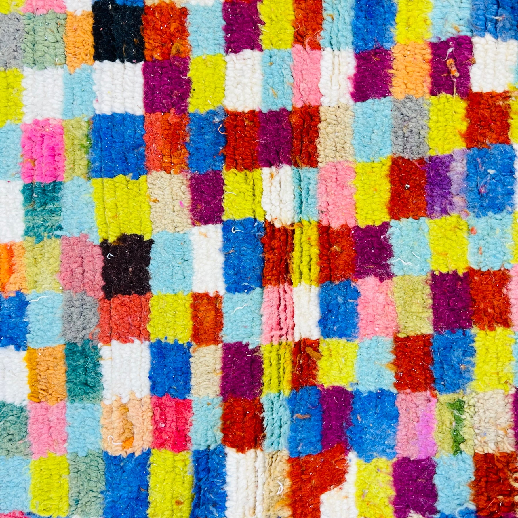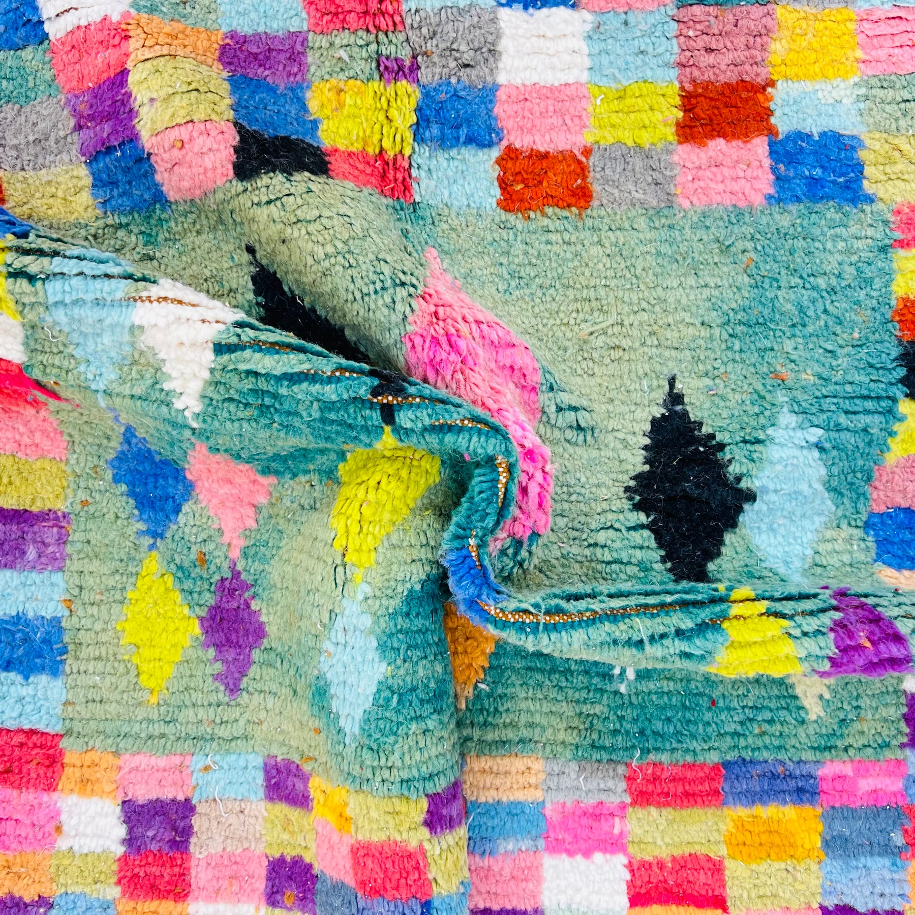Bring home a burst of vibrant heritage with this one-of-a-kind vintage Moroccan wool rug, handwoven by skilled Berber artisans. Featuring a mesmerizing central lozenge motif surrounded by a multicolored checkerboard pattern, this rug is rich in symbolism and storytelling. The color palette ranges from rich jewel tones to soft pastels, adding a dynamic touch to any space.