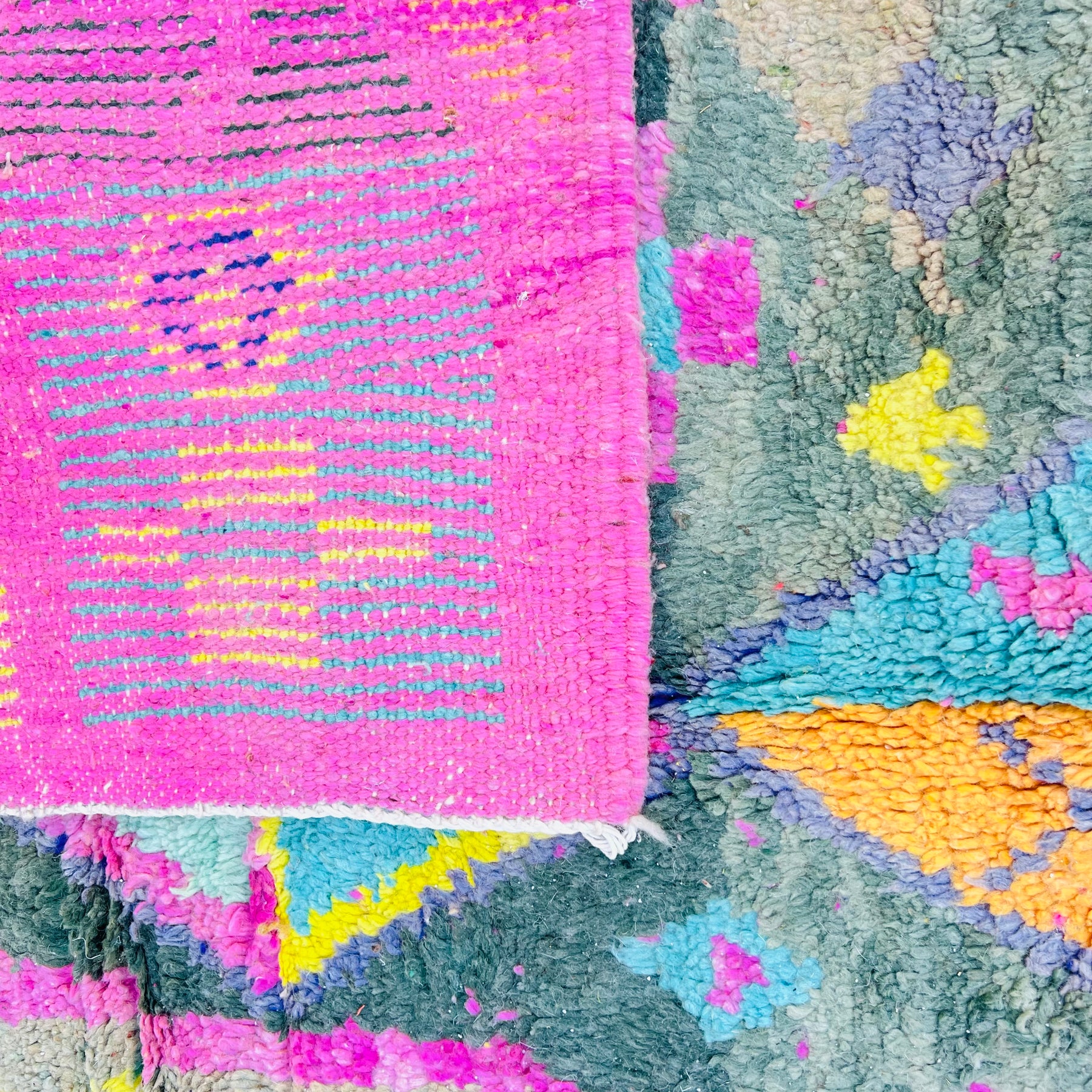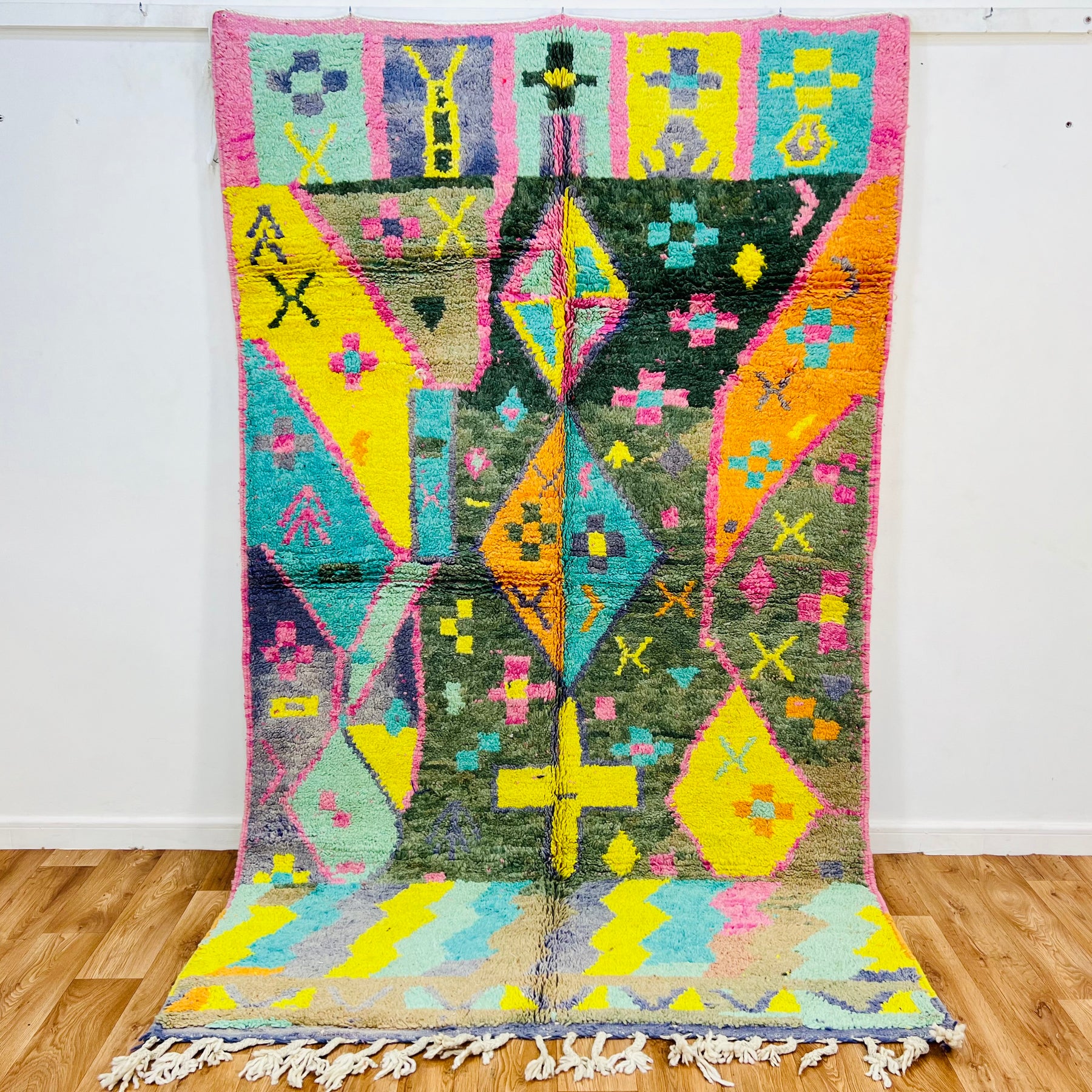Add a splash of color to your home with this vintage Moroccan rug, handwoven with vibrant character and deep symbolism. Rug 602 is crafted from 100% natural wool by skilled Berber artisans using traditional techniques passed down through generations. The rug features a rich tapestry of symbols and diamond motifs layered over a deep green base with accents in pink, yellow, turquoise, orange, and purple. This one-of-a-kind piece brings joyful energy and authentic Moroccan heritage to any space.
