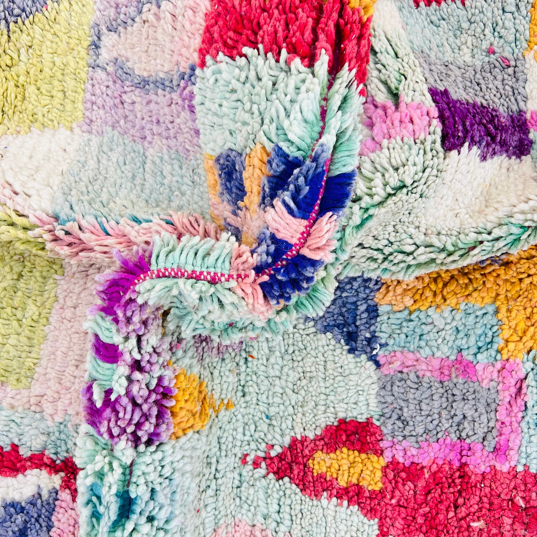 This one-of-a-kind vintage Moroccan rug (Rug 605) is a joyful celebration of color and tradition. Handwoven with premium wool by Berber artisans, it features a stunning patchwork of geometric motifs in vibrant tones including red, lilac, teal, yellow, and orange. The playful arrangement and unique patterns reflect centuries-old weaving techniques passed down through generations.