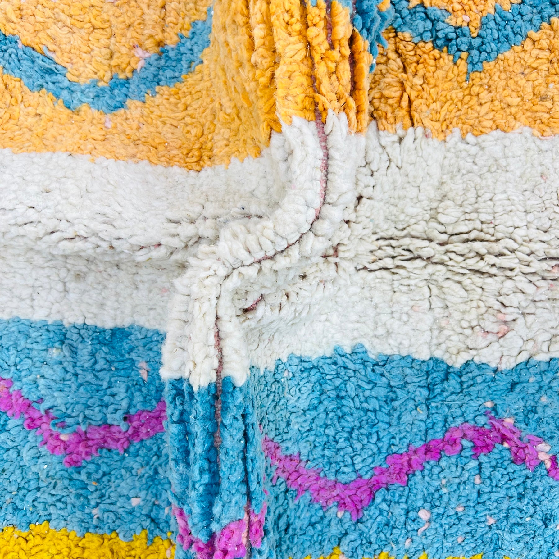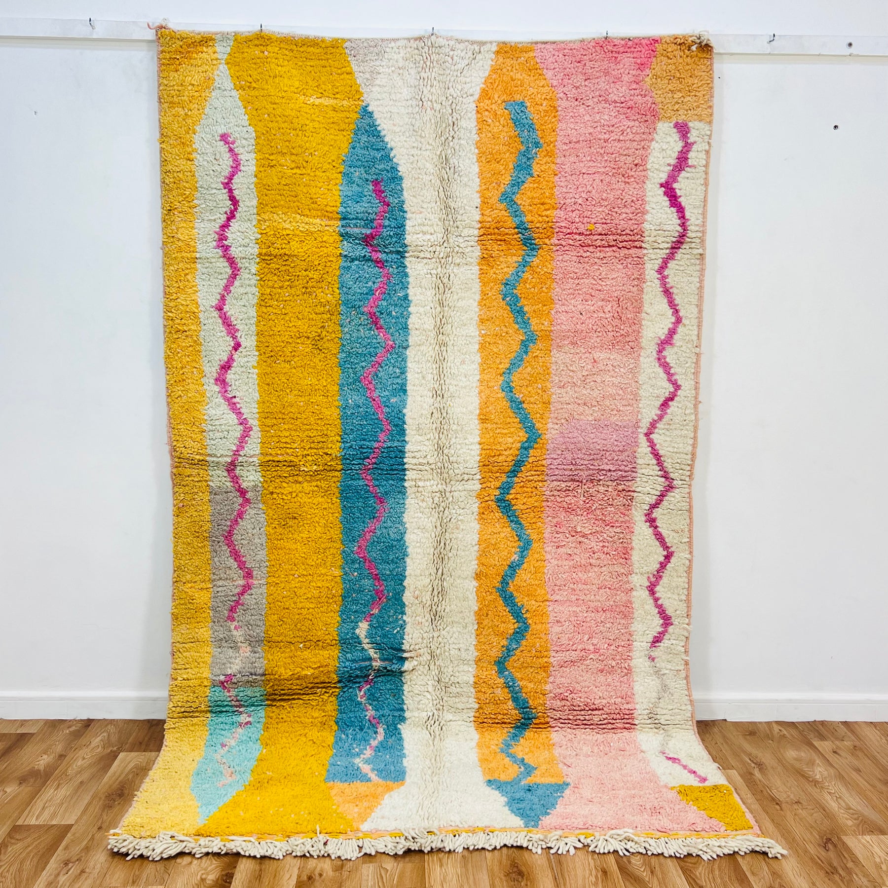 Infuse vibrant charm into your space with this handmade vintage Moroccan wool rug (Rug 617). Crafted in Morocco using natural wool, this eye-catching piece showcases bold vertical bands in golden yellow, teal blue, pastel pink, and cream, accented with playful zigzag lines in fuchsia and turquoise. The colorful symmetry and plush texture make it ideal for adding personality to your living room, bedroom, or creative studio.