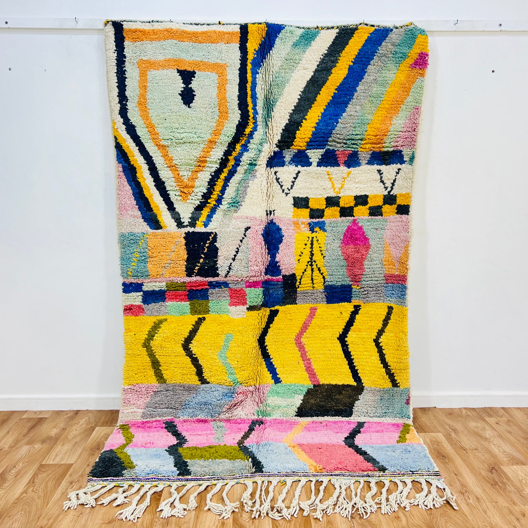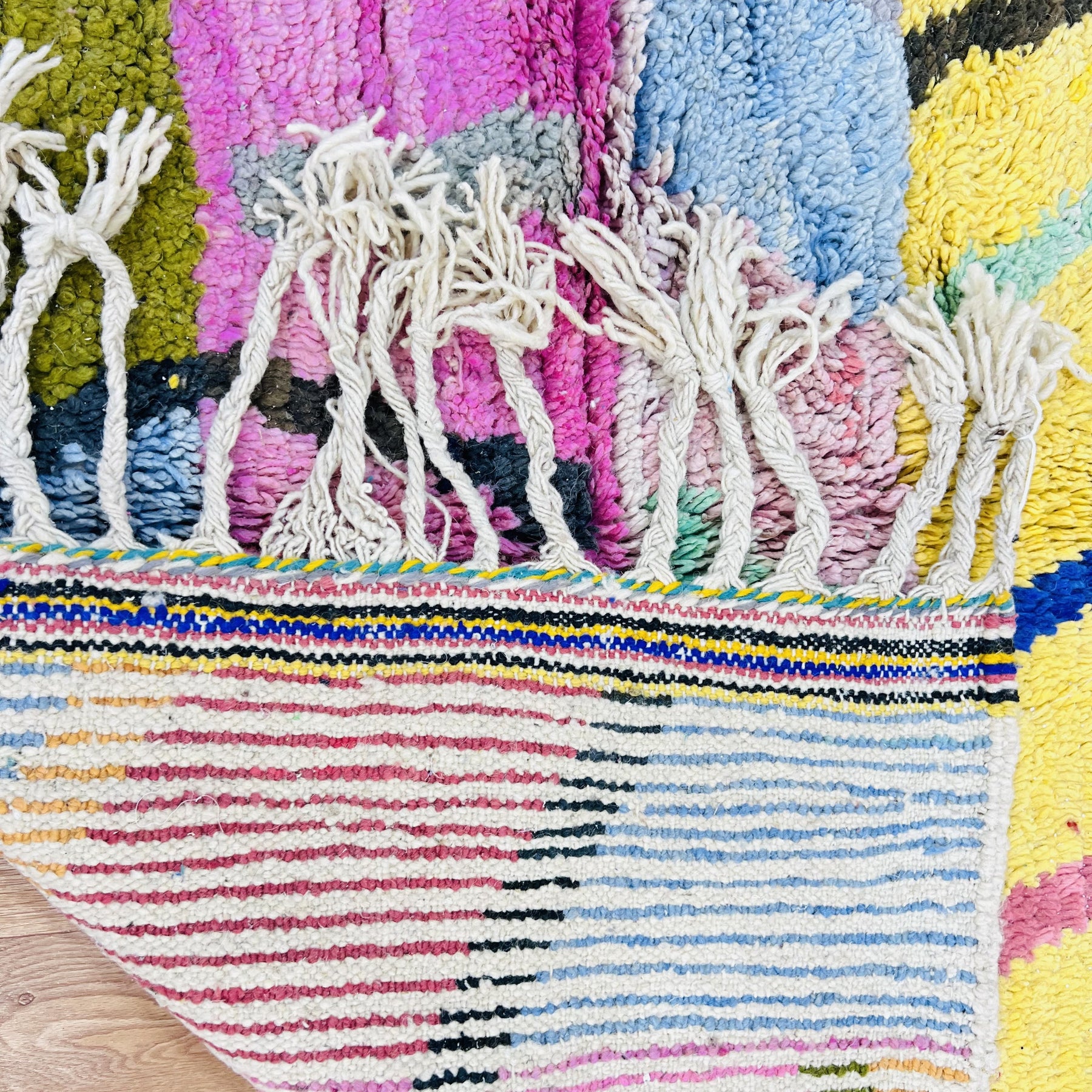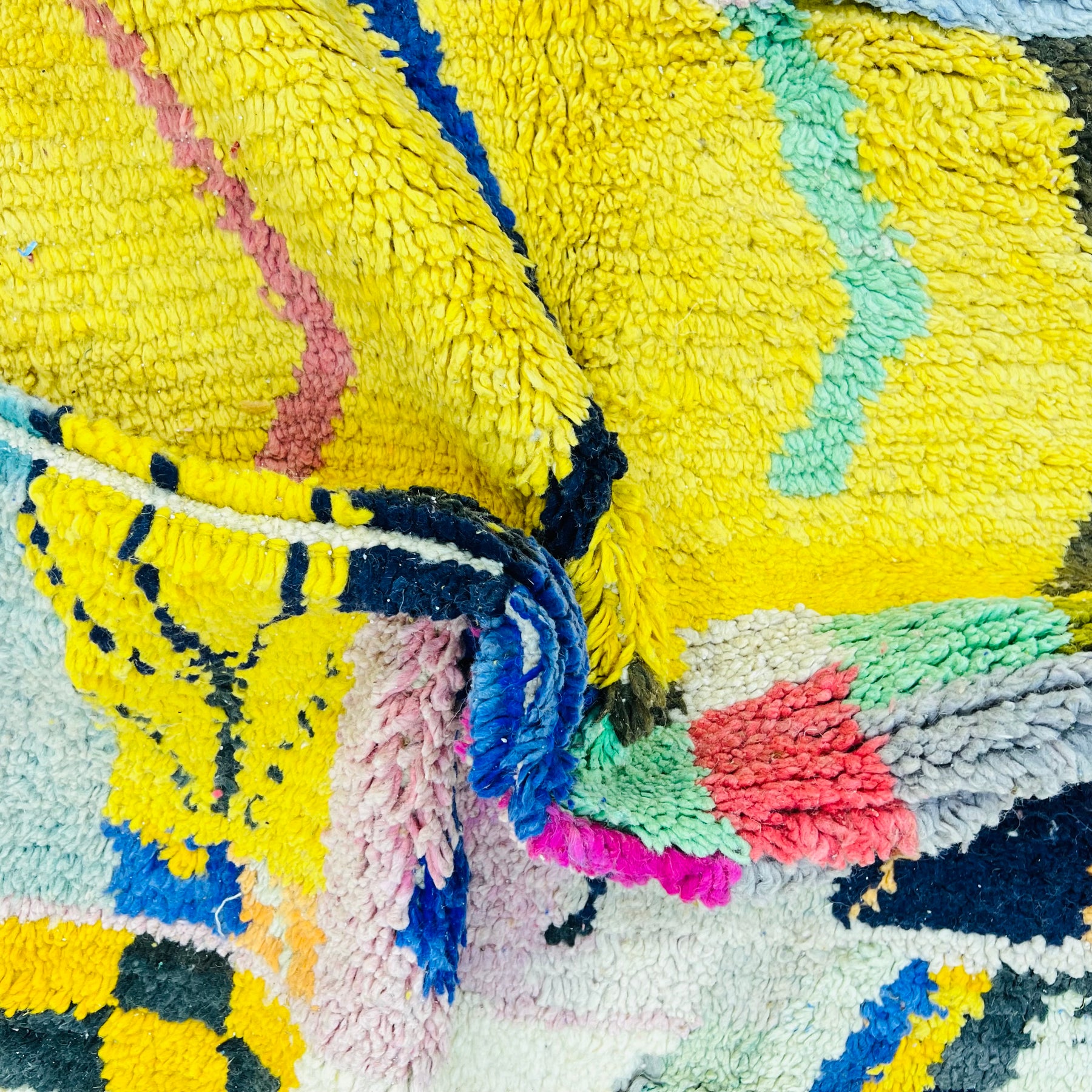 Bring bold artistry into your space with this handmade vintage Moroccan rug (Rug No. 618). Featuring vibrant patterns in shades of yellow, pink, blue, and black, this Berber masterpiece blends geometric motifs and cultural storytelling. Handwoven from soft wool by Moroccan artisans, it adds a cheerful and unique touch to any living room, hallway, or creative workspace.