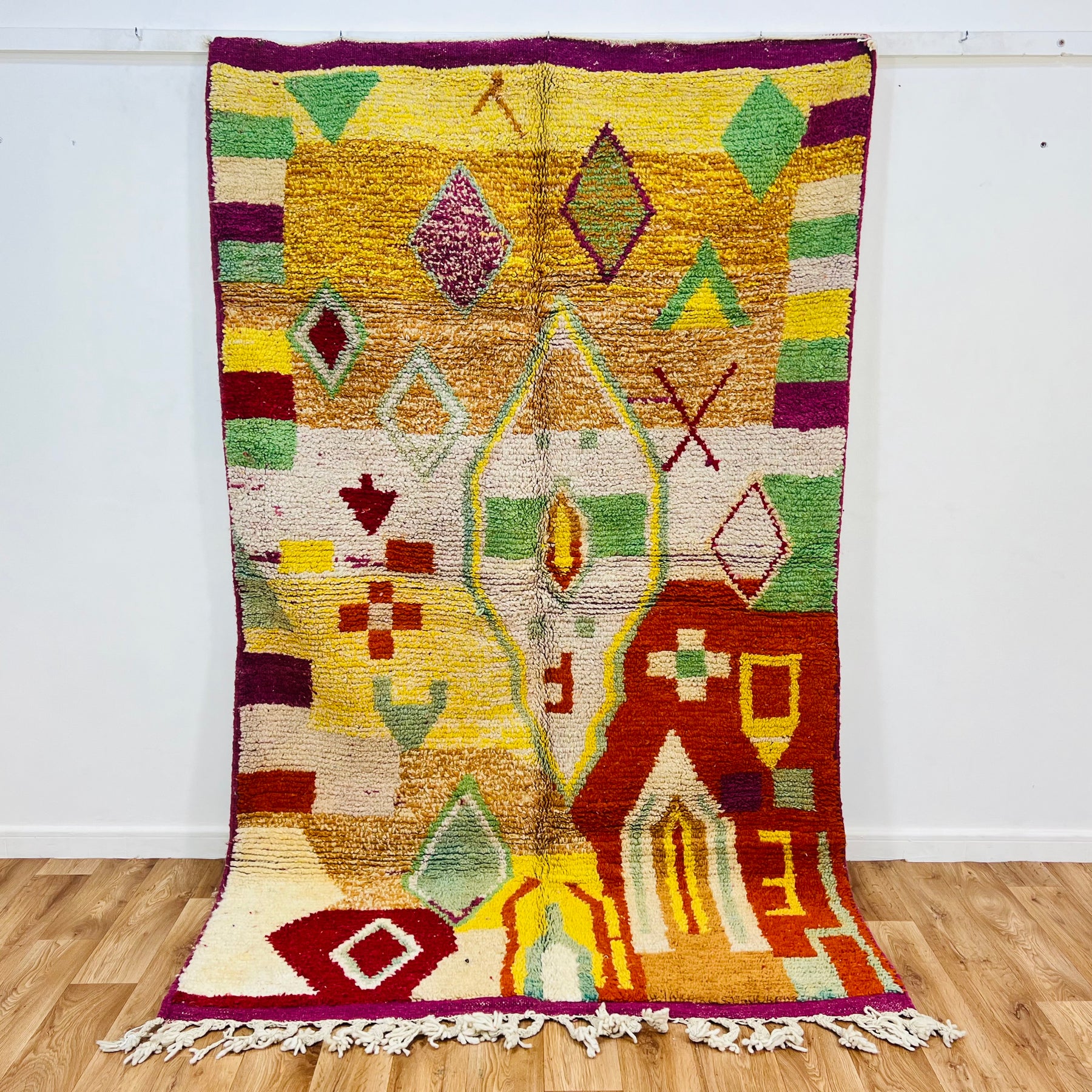Introducing Rug No. 653 — a stunning handmade vintage Moroccan rug bursting with geometric creativity and traditional Berber motifs. Woven with vibrant shades of mustard yellow, burgundy, forest green, orange, cream, and deep red, this one-of-a-kind piece captures the rich storytelling and artistry of Moroccan culture.