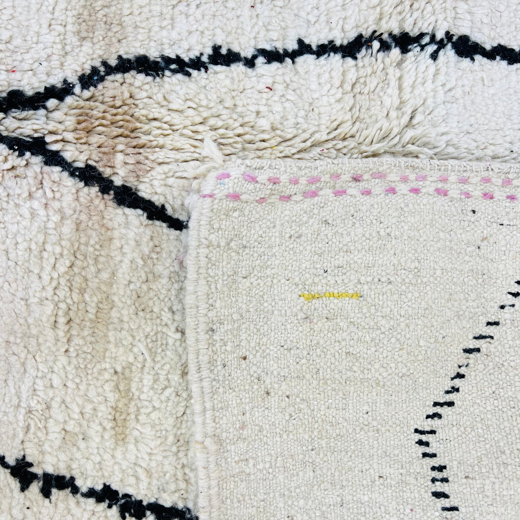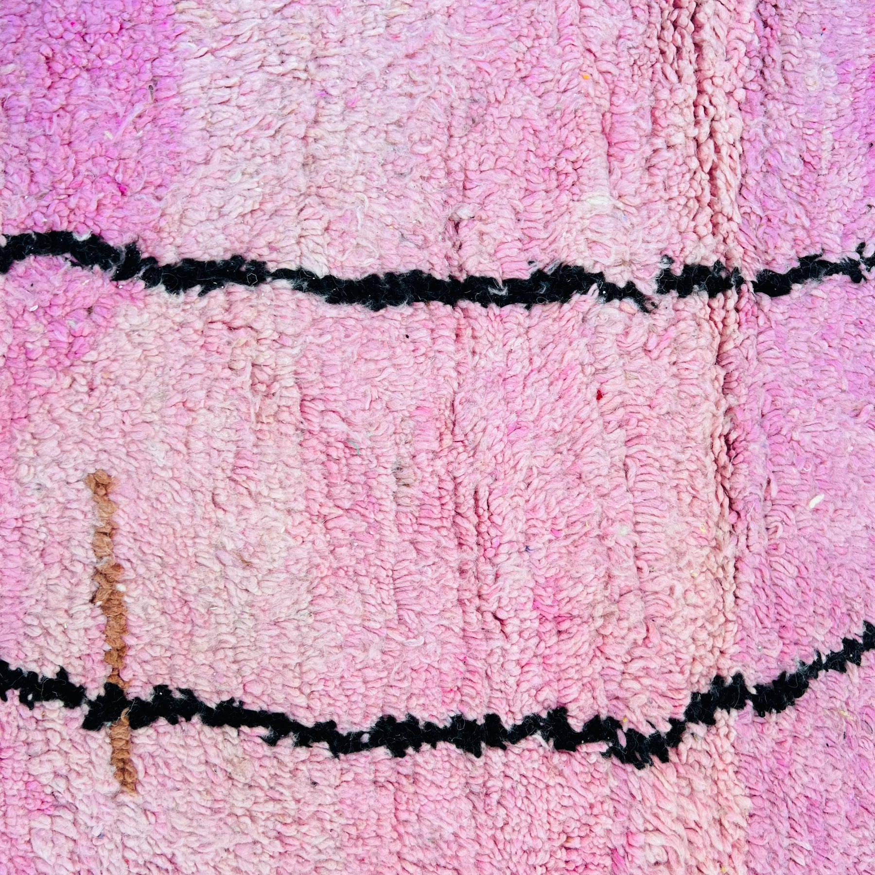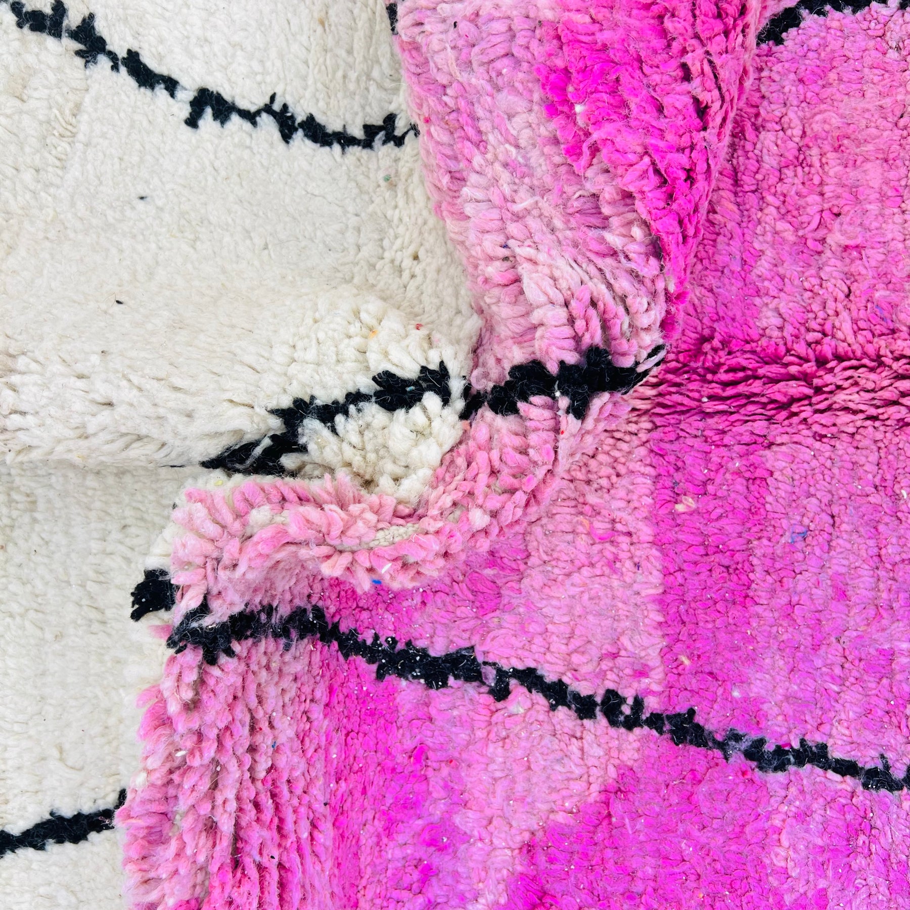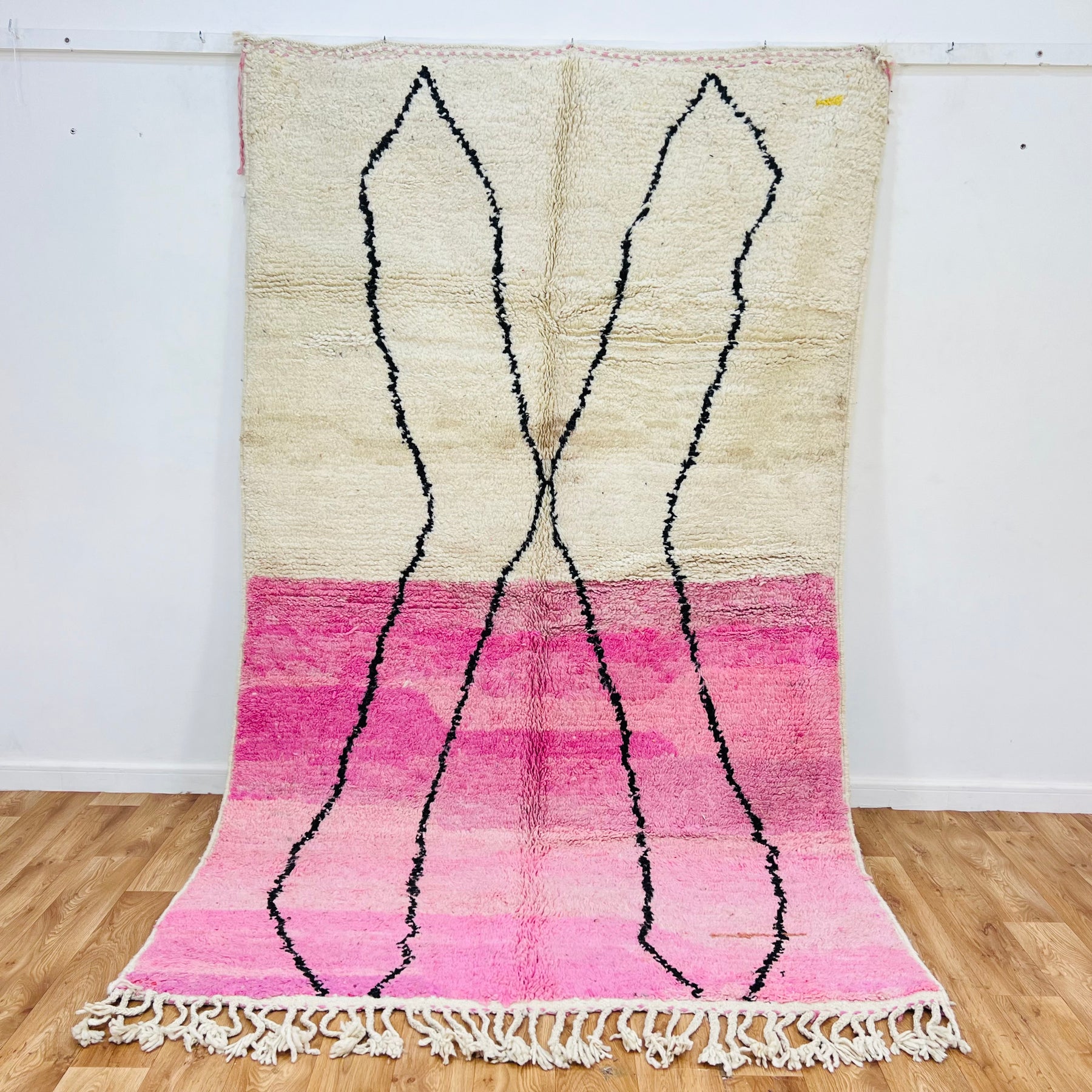 Bring bold character and soft charm to your space with this one-of-a-kind Vintage Moroccan Wool Rug. Featuring a stunning gradient design that flows from natural ivory to vivid pink tones, this handmade rug is accented by two elegant black abstract diamond lines that intersect at the center.