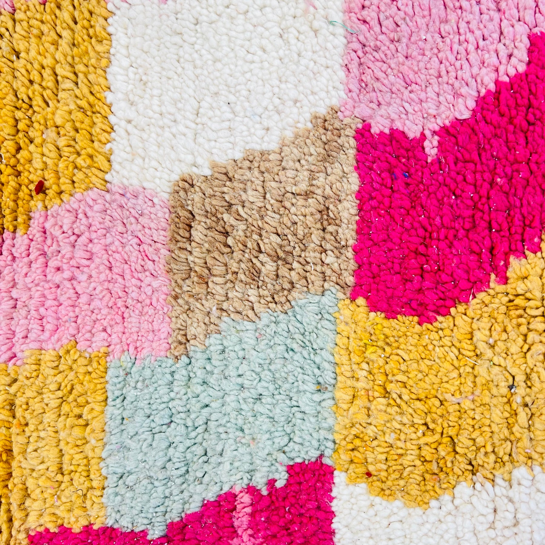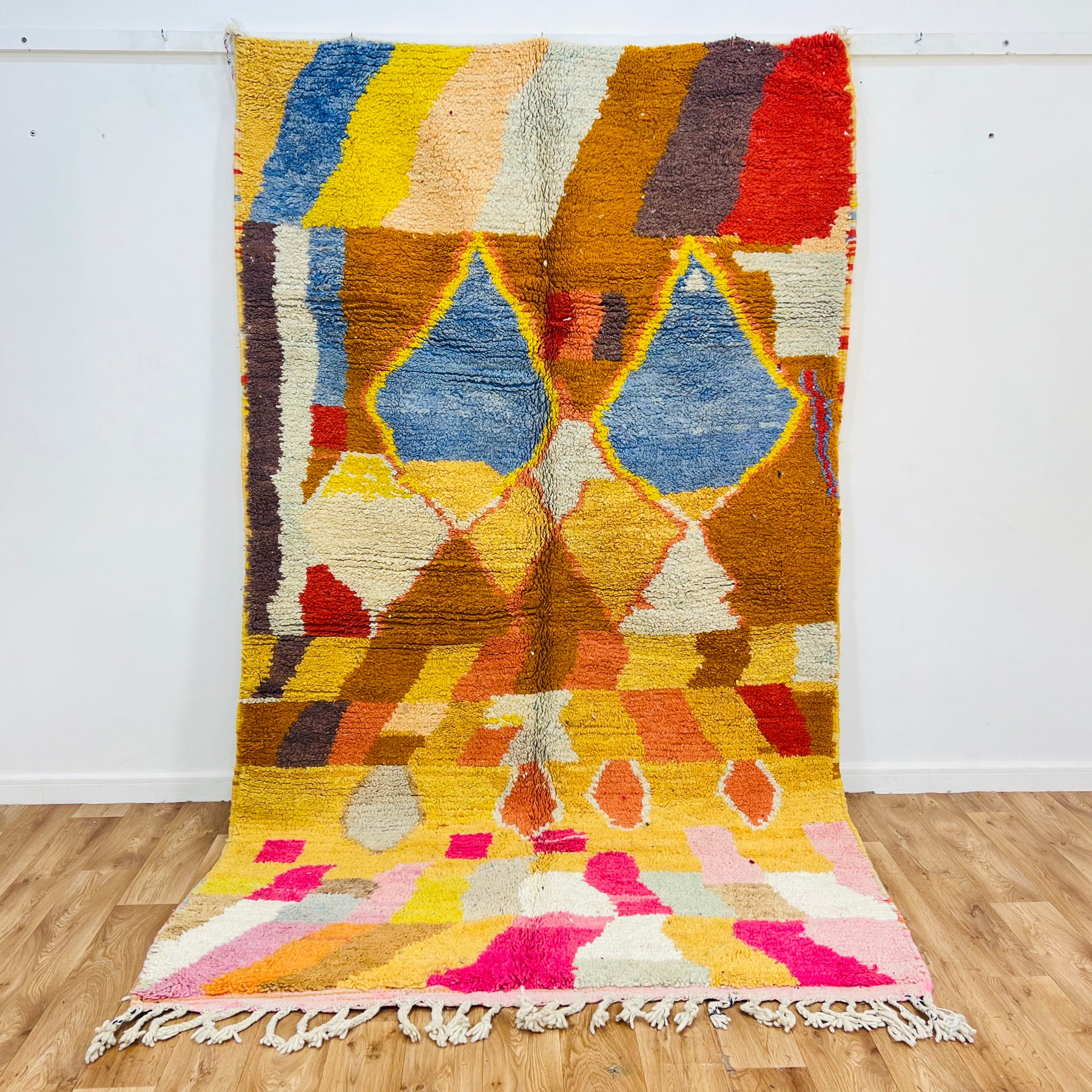 Add warmth and vibrant personality to your space with this stunning vintage Moroccan rug. Handwoven using traditional Berber techniques, this piece bursts with life through its rich, earthy tones of ochre, red, and rust, highlighted by blue diamond motifs and soft pastel accents. The symmetrical center forms a pair of blue diamonds reminiscent of traditional Amazigh symbolism, reflecting harmony and protection.