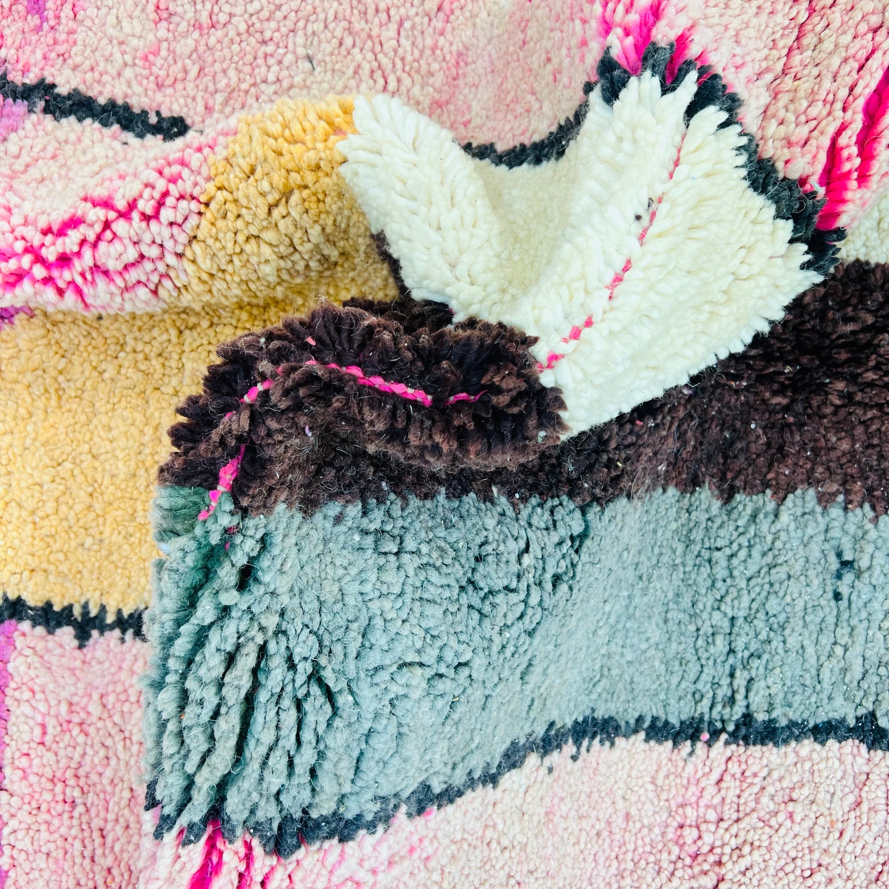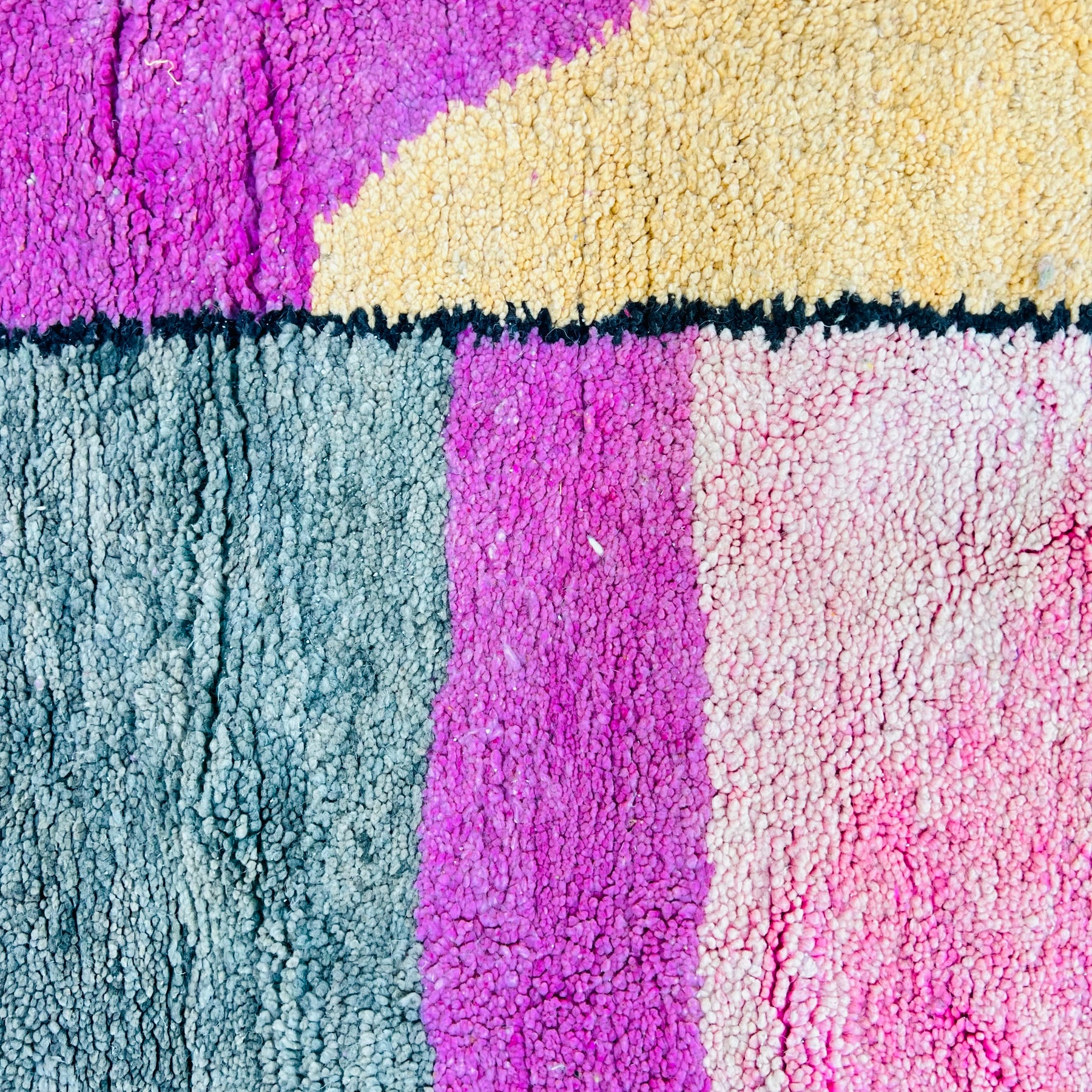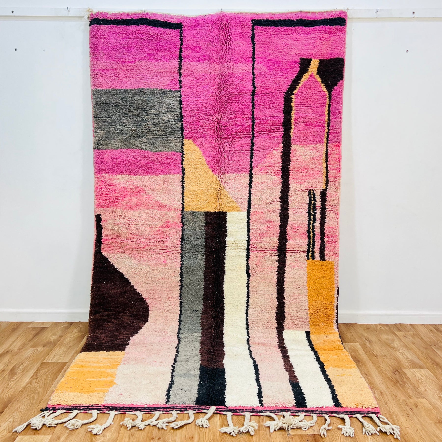 This one-of-a-kind Moroccan wool rug blends contemporary art with traditional craftsmanship. Perfect for living rooms, bedrooms, or creative studios.