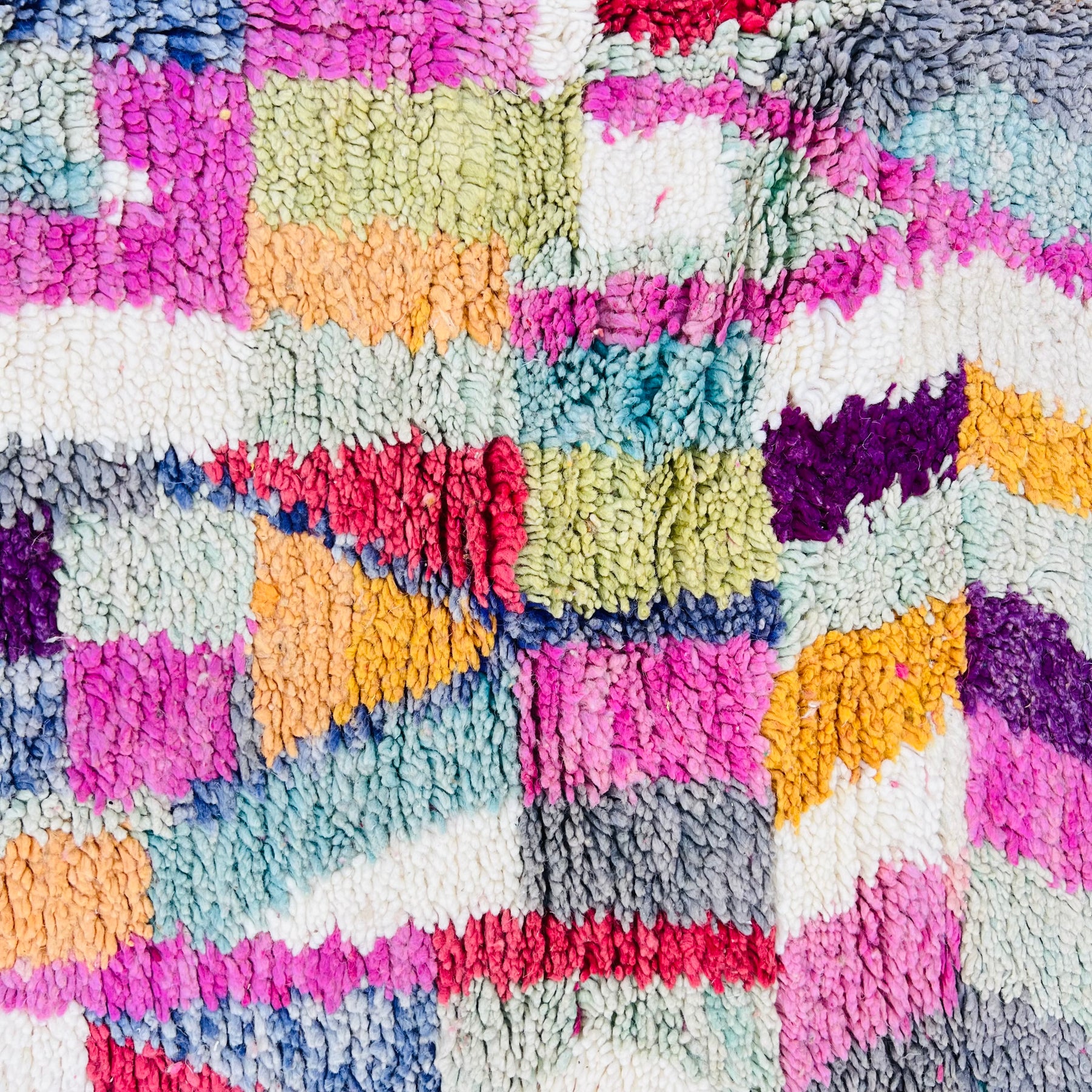 The pattern features playful angles and color stripes reminiscent of mountain landscapes and artistic abstraction—perfect for adding a touch of Moroccan charm to any living room, bedroom, or studio. Its thick wool texture provides warmth and comfort underfoot, while the unique design makes it a one-of-a-kind statement piece.
