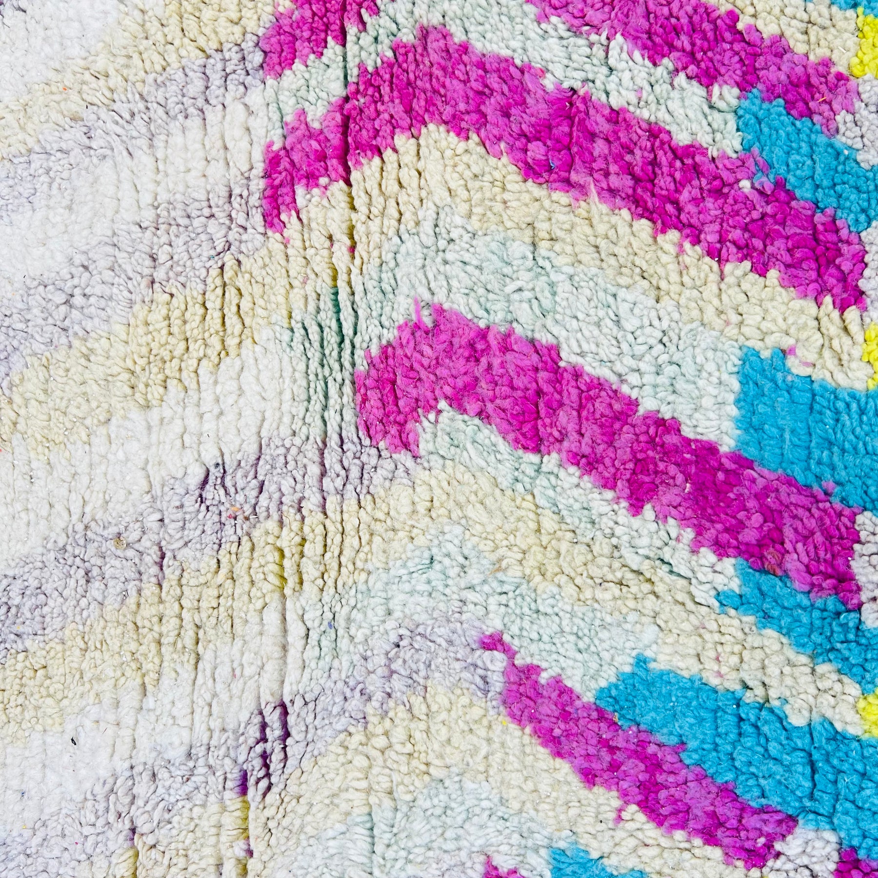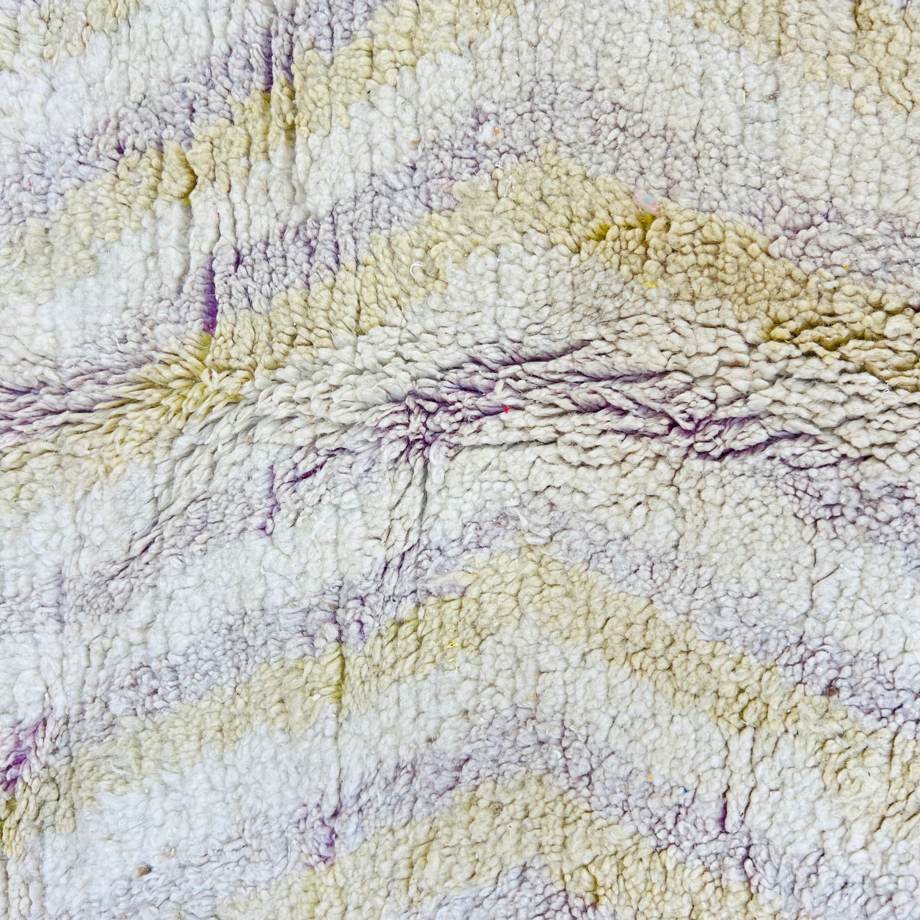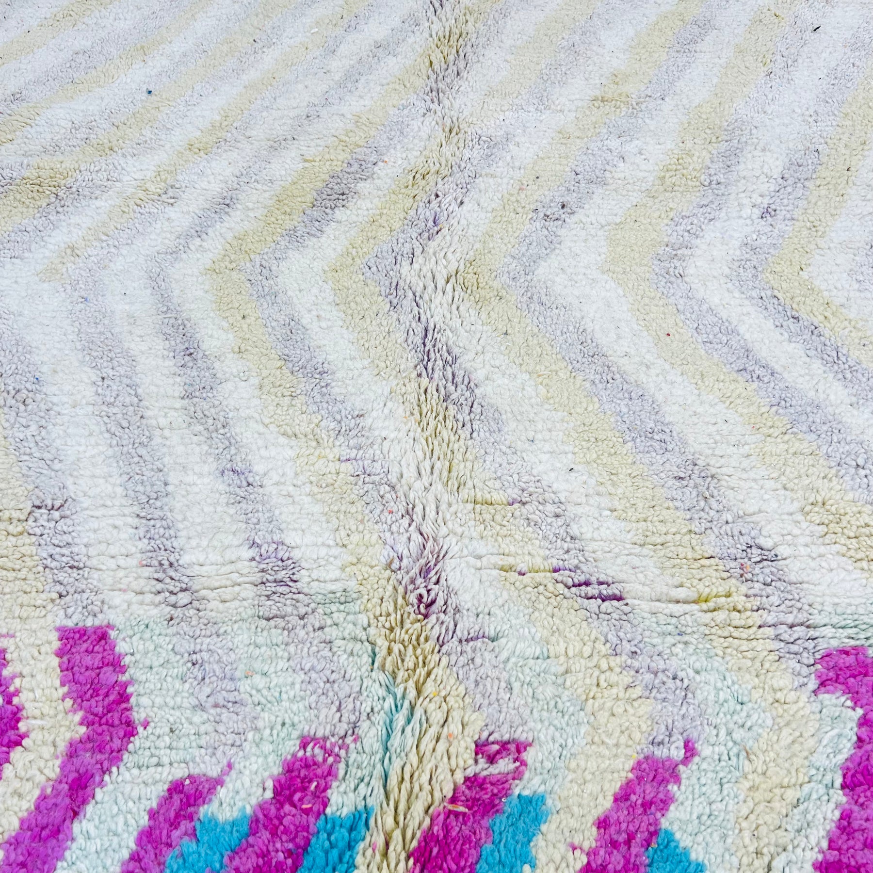 Introducing Rug No. 675 — a striking vintage Moroccan rug handmade with care and cultural heritage. This 246x162 cm (8.07x5.31 ft) piece features a bold chevron pattern in soft beige tones, accented with pastel yellow and lilac lines. What makes it truly unique is the vibrant splash of color at the bottom border, with playful pink, turquoise, and yellow forming a zigzag base that adds joyful character.