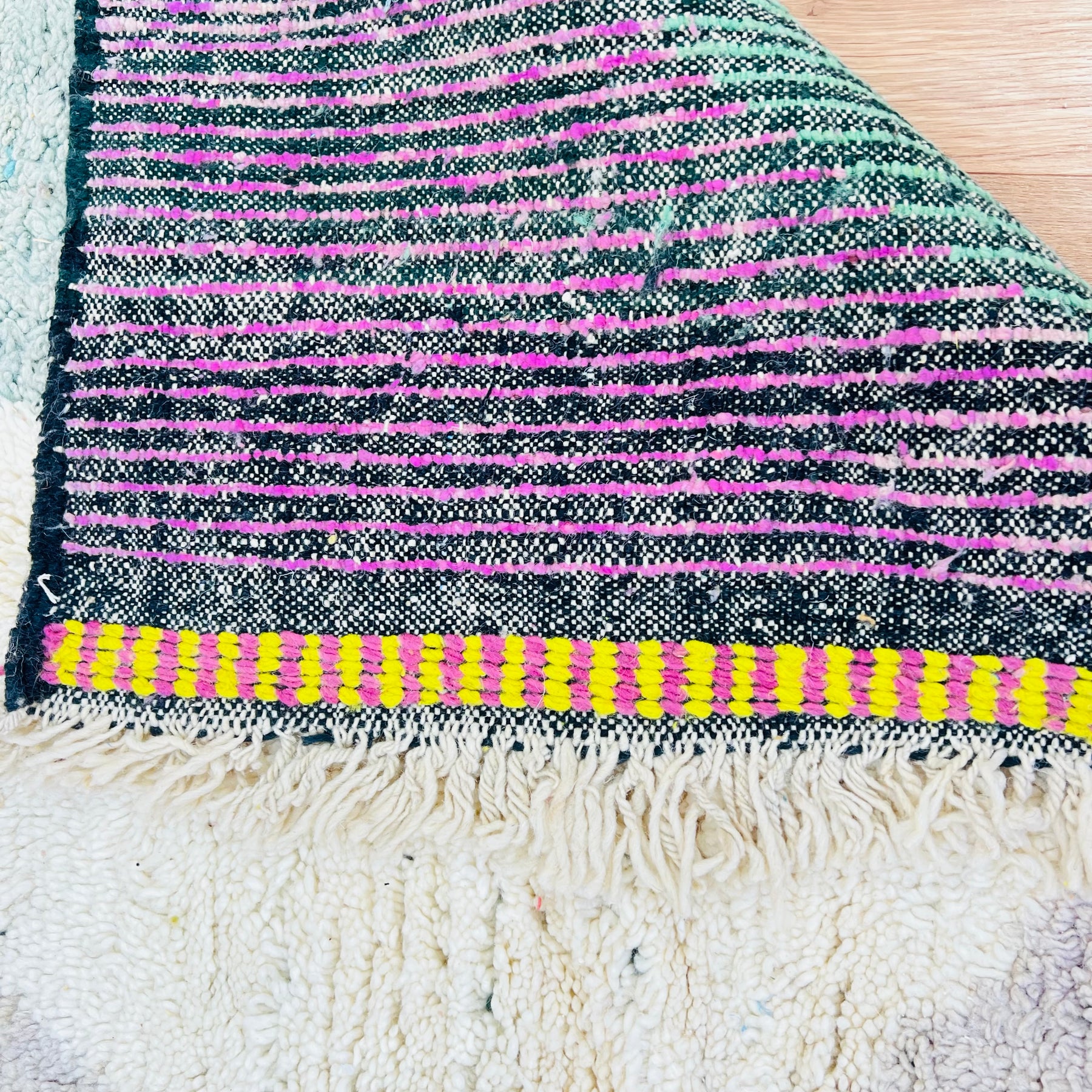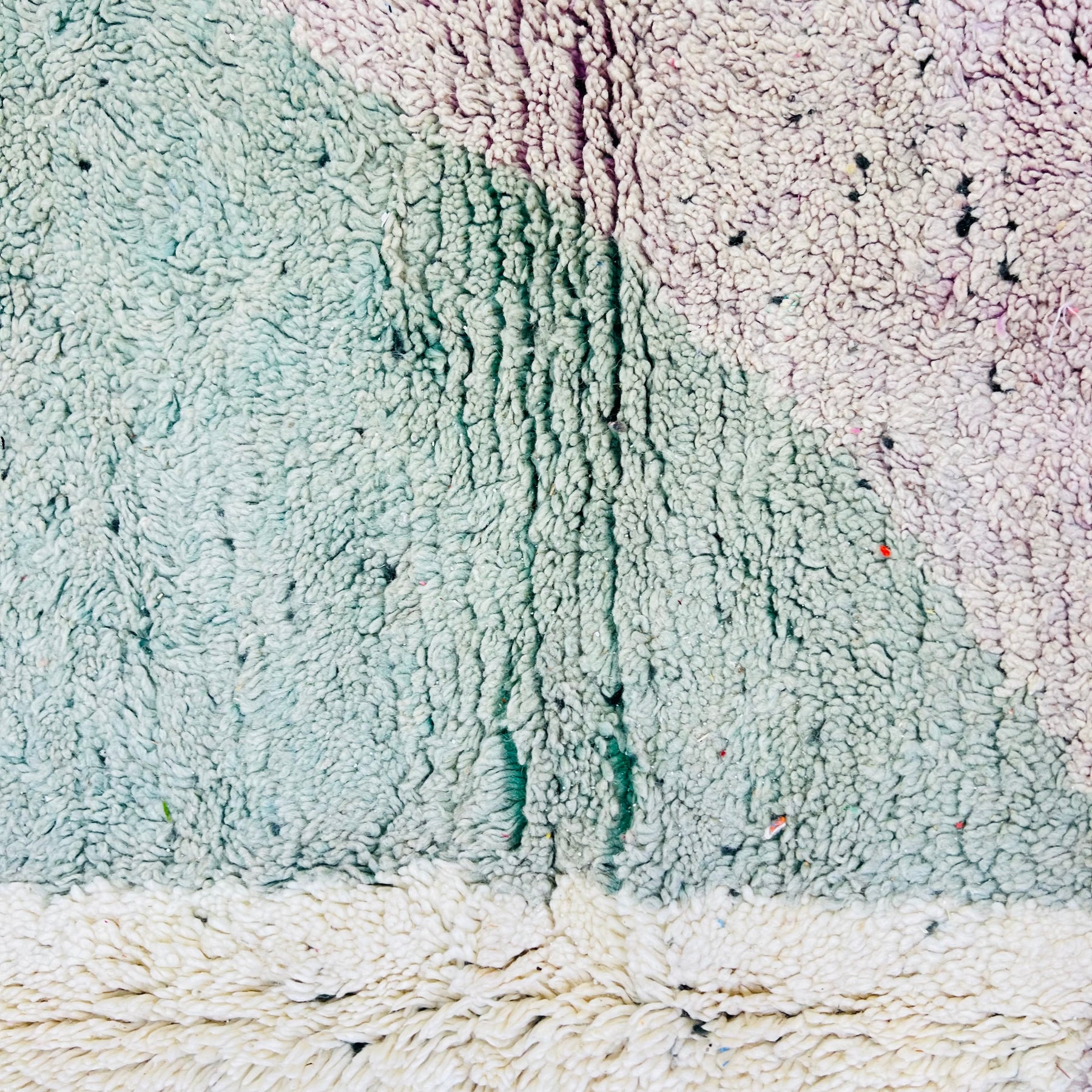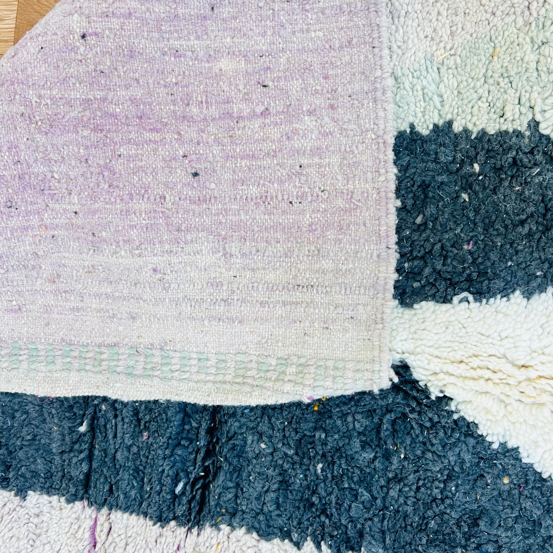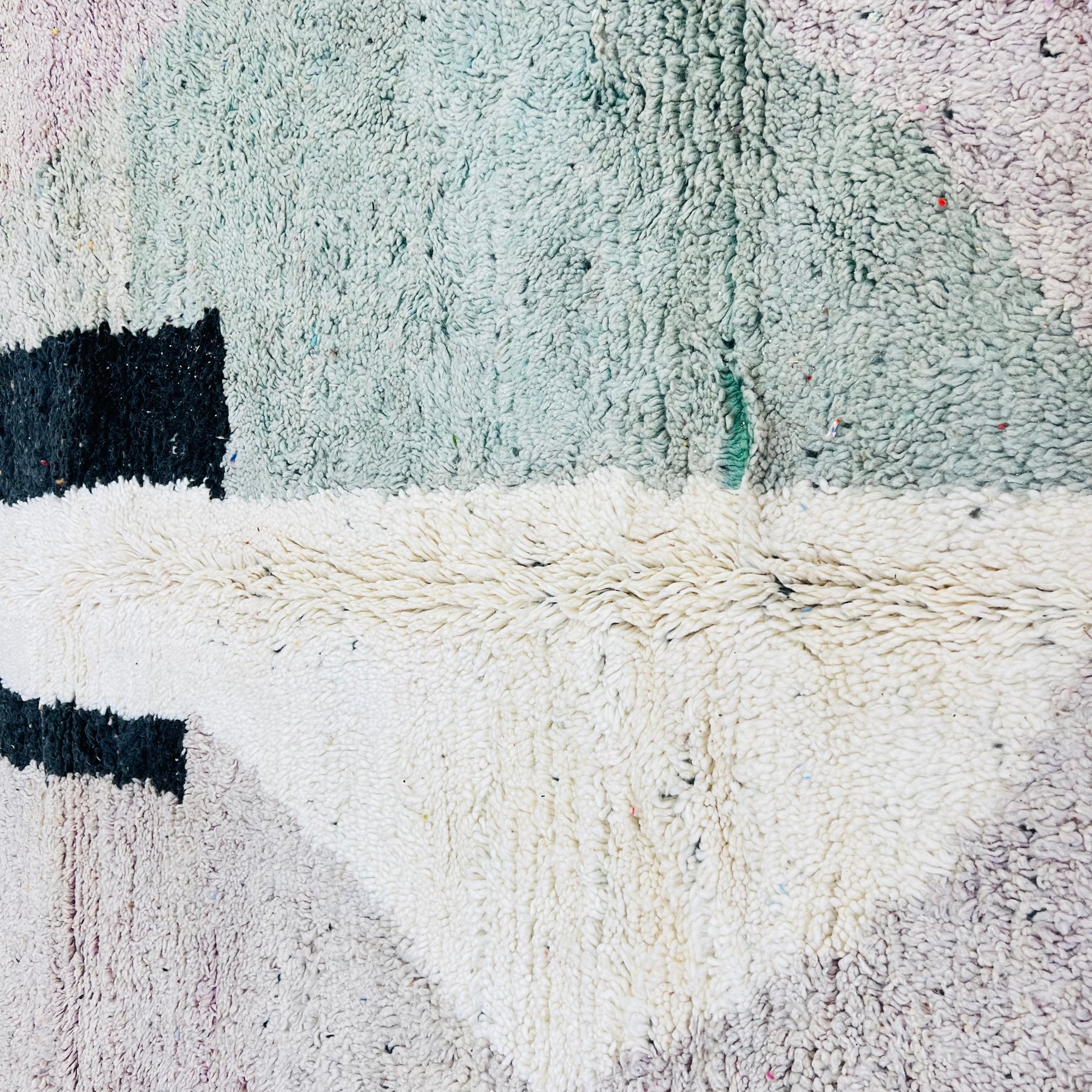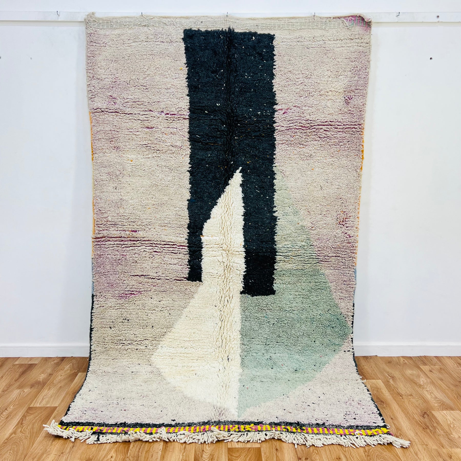 Bring bold character and artistic flair to your space with this handmade vintage Moroccan wool rug. Rug number 678 showcases a stunning abstract design with a bold black vertical form intersecting a soft cream and mint semi-circle — creating a powerful visual impact. The background features a delicate blend of muted natural tones with subtle purple hints, adding depth and character to the composition.