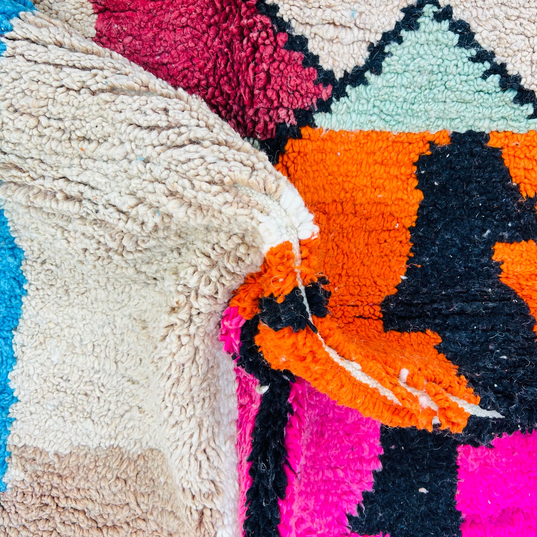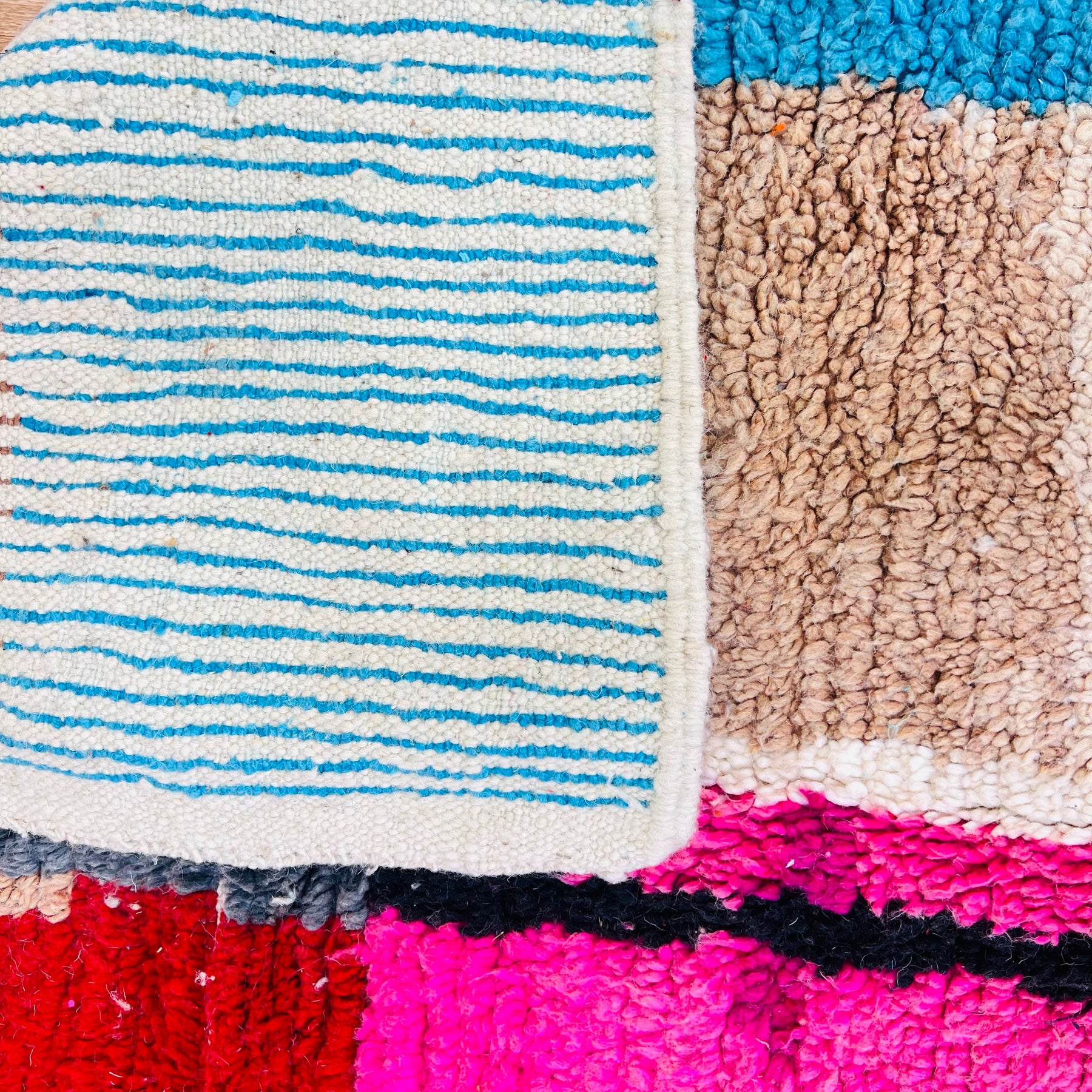 Bring bold artistry and vibrant charm into your space with this one-of-a-kind vintage Moroccan rug. Handwoven using traditional Berber techniques, this piece features a captivating fusion of deep red, pink, orange, beige, and blue blocks, harmonized by a tribal grid pattern near the base. The bold black spine running vertically evokes natural symbolism and tribal storytelling unique to Moroccan culture.