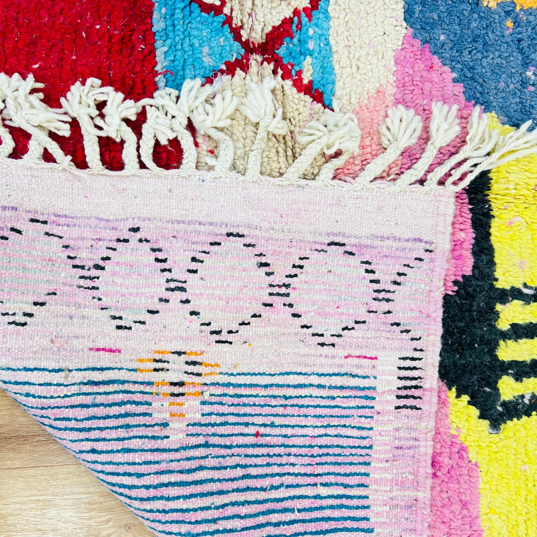 Expertly woven by artisans in Morocco, this one-of-a-kind rug blends traditional craftsmanship with modern color blocking. The thick pile offers plush comfort underfoot, making it a standout piece in any bohemian, eclectic, or contemporary setting.