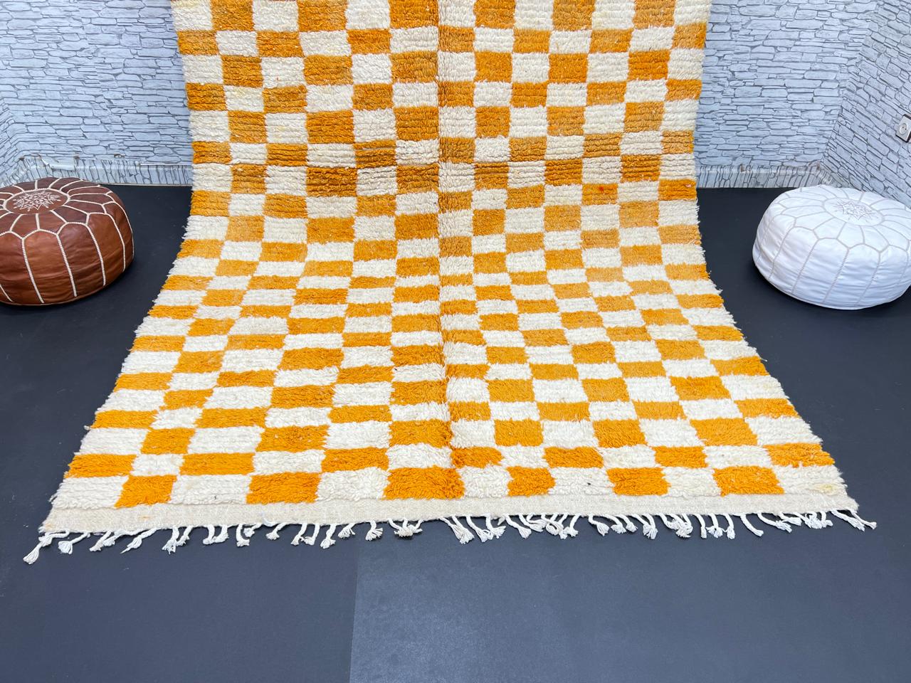 Brighten your space with this Yellow Checkered Moroccan Wool Rug, handwoven by skilled Berber women using 100% natural sheep wool. This rug features a bold checkerboard pattern in vibrant yellow and creamy white tones, creating a lively yet elegant statement for your home.